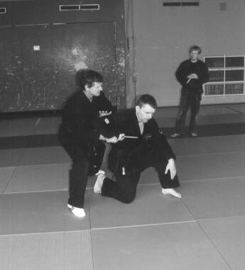 Zuerst stand die Verkettung von Techniken auf dem Programm. Ausgehend vom Gelbgurt-Prüfungsprogramm zeigte Franz-Josef, wie man Techniken sinnvoll verknüpft und schnell kombiniert, wenn ein Gegner versucht, sich aus einer Technik zu lösen. Die Kontrolle des Gegners am Boden durch Festlegetechniken war ein weiteres Thema. Franz-Josef erläuterte, daß es gerade in der freien Verteidigung wichtig sei, von einer Technik schnell zu einer anderen „umzuschalten“ und den Gegner so weiter zu kontrollieren.