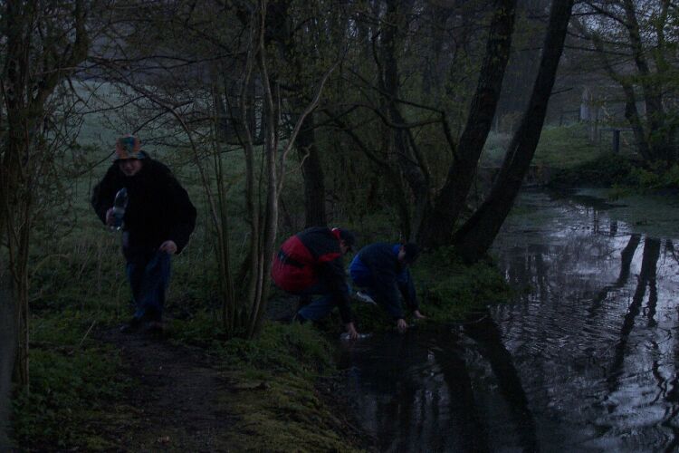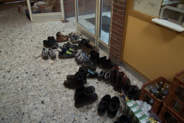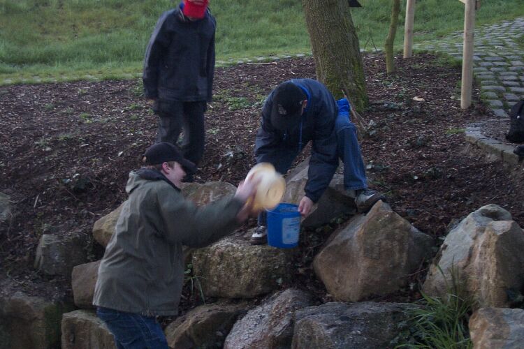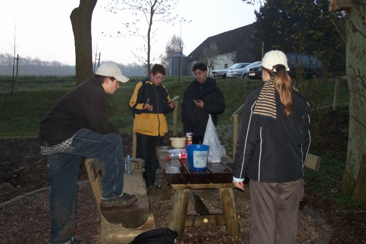 Richtig verlaufen haben sich zum Glück nur ein paar Schüler und auch diese befanden sich bald wieder auf dem richtigen Pfad. Die Gruppen waren teilweise schon von weitem zu hören und manchmal auch zu sehen, denn die Meisten hatten sich Angelknicklichter an die Mützen oder an die Jacke gesteckt. Nach und nach konnte die Jugendleitung die abgekämpften Schüler im Ziel begrüßen. Hier galt es ein letztes Rätsel zu lösen. "Wie misst man mit einem 5 Liter Eimer und einem 3 Liter Eimer durch umschütten exakt 4 Liter ab?" Das Rätsel kannten einige, aber für die Lösung hatte auf anhieb keiner parat.