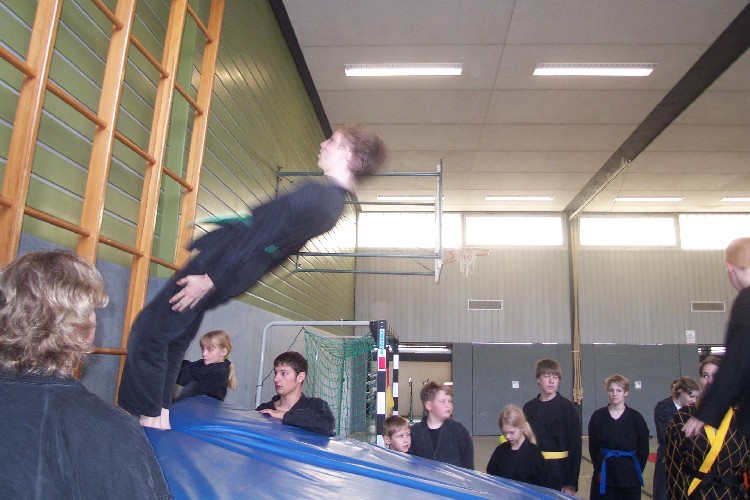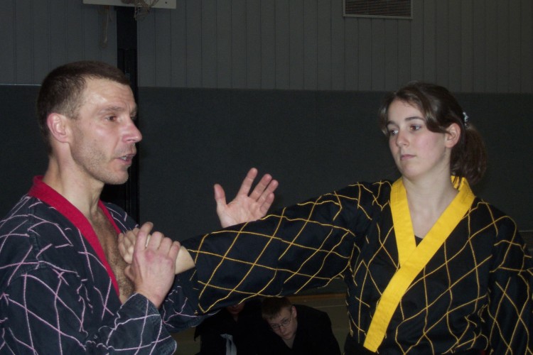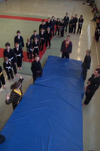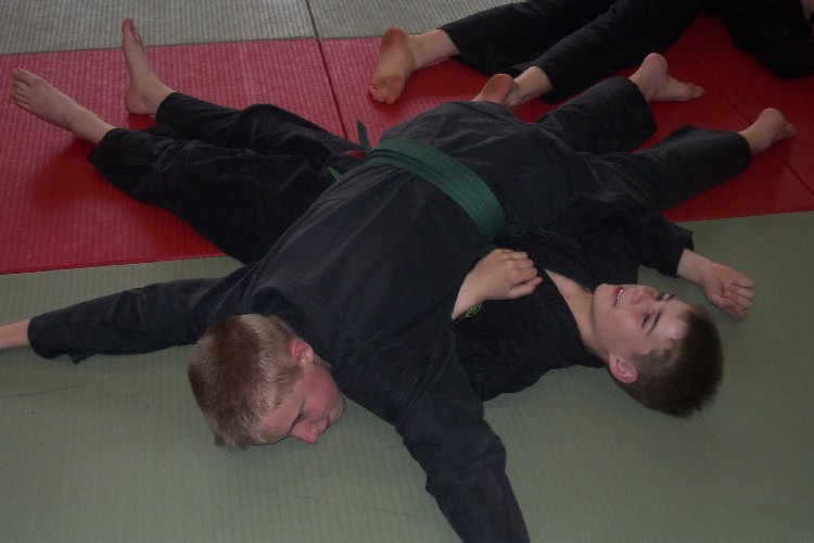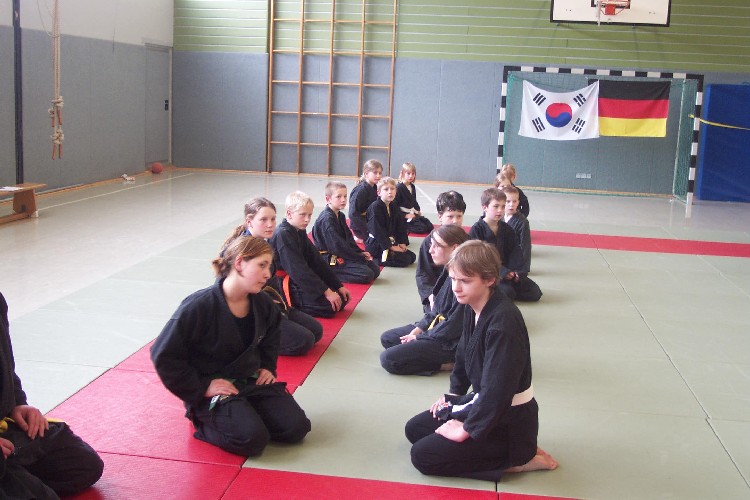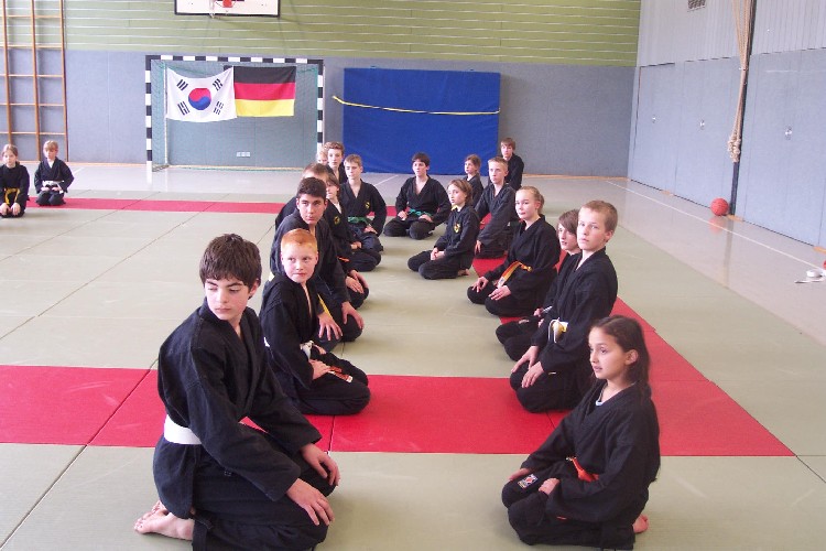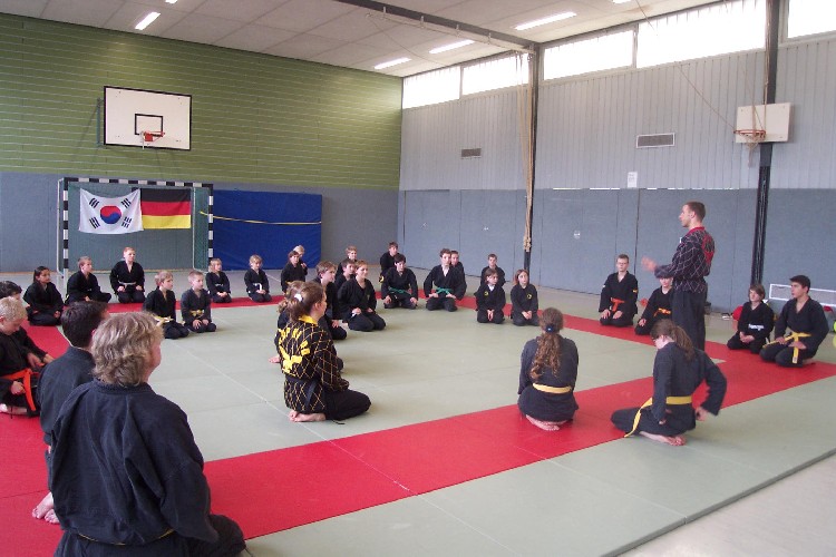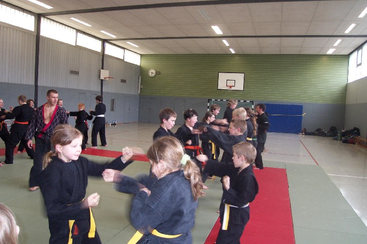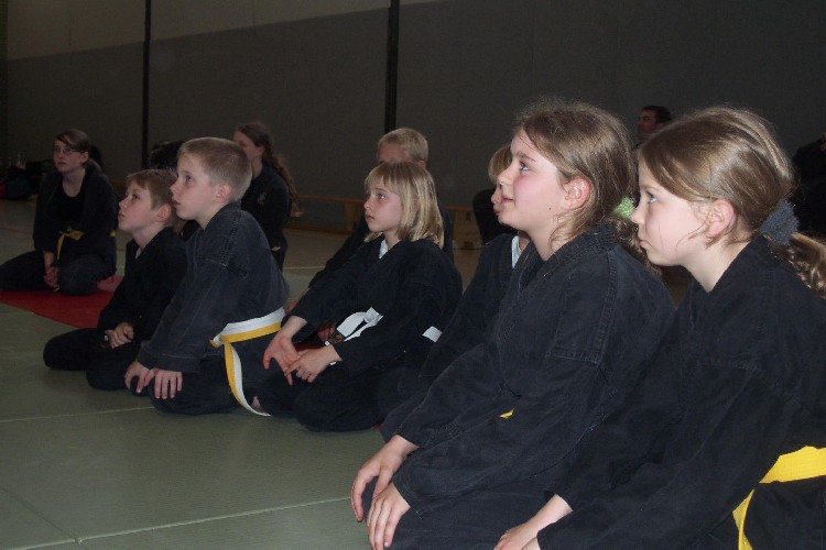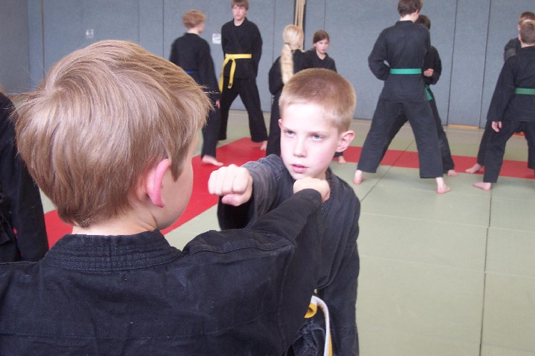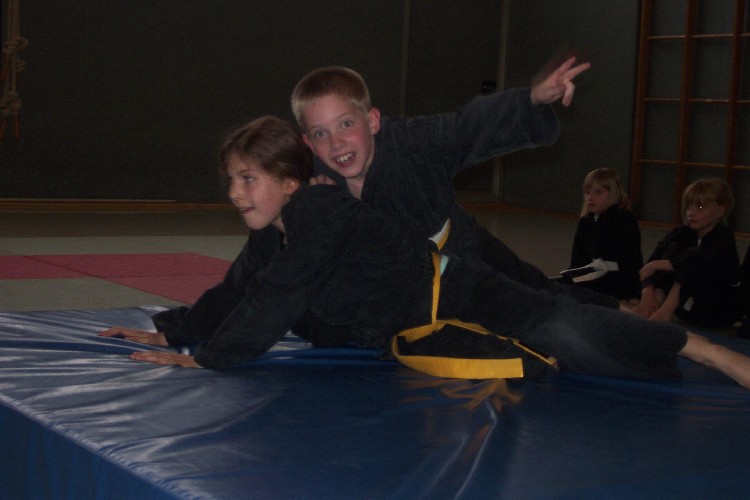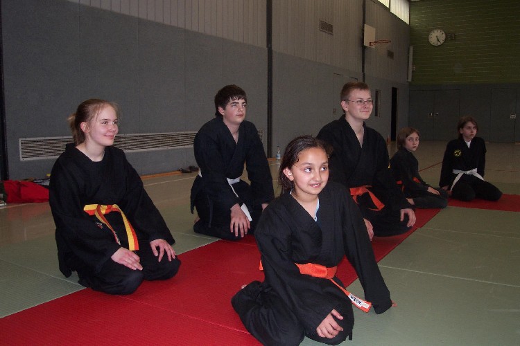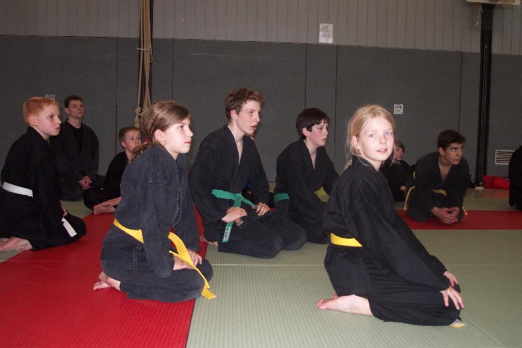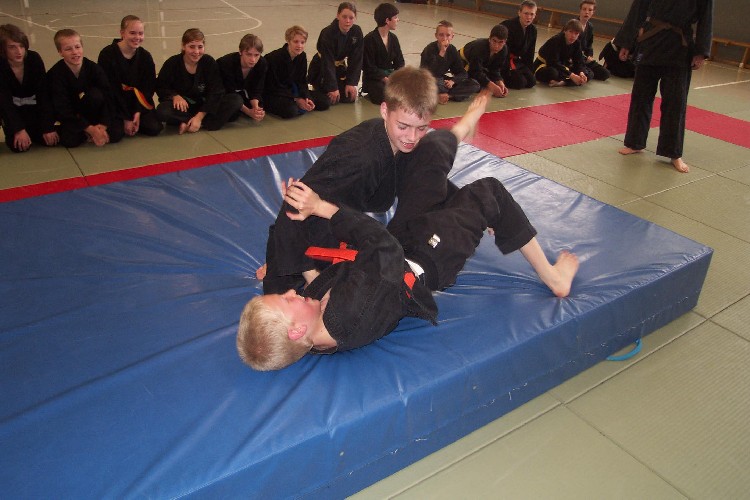 Meike Betzler (I Dan) und Jürgen Rath (IV Dan) verdeutlichten den Jugendlichen wie man sich Angreifern gegenüber behaupten kann. Um das dafür nötige Selbstvertrauen zu schaffen standen immer wieder Übungen zur Körpererfahrung auf dem Programm wie rückwärts auf eine schräge Matte fallen, ohne sich abzustützen, oder im Randori gegen andere bestehen. Genau so wichtig waren auch viele Grundschläge und Tritte, deren Studium sich oft auch in eine Übung zur Selbstdisziplin verwandelte.