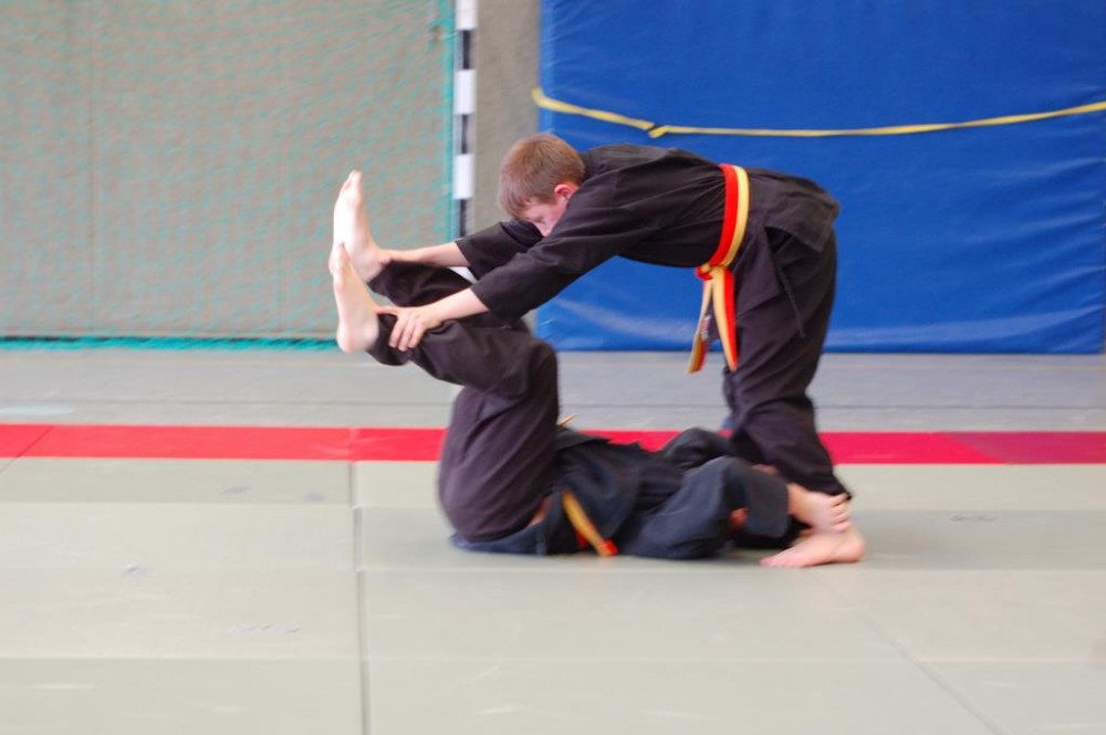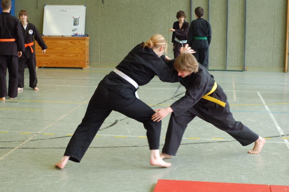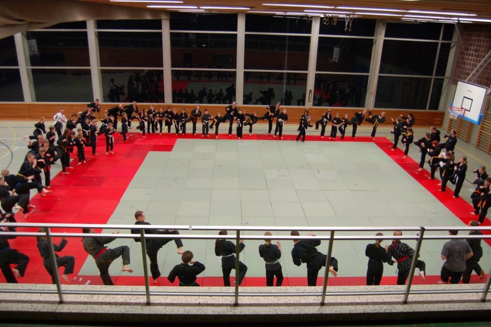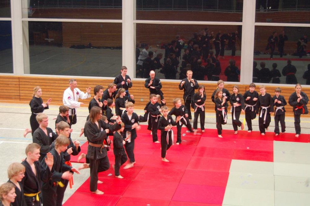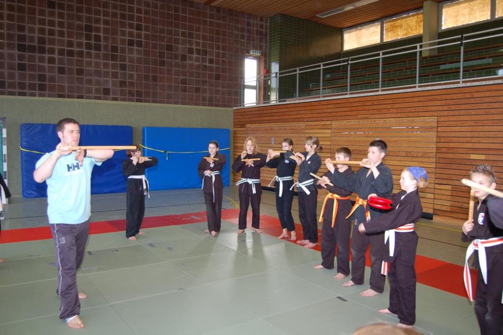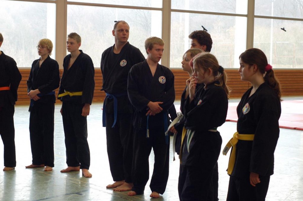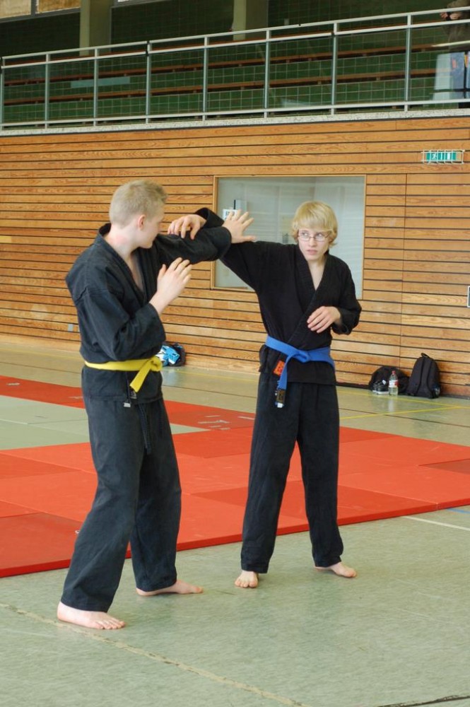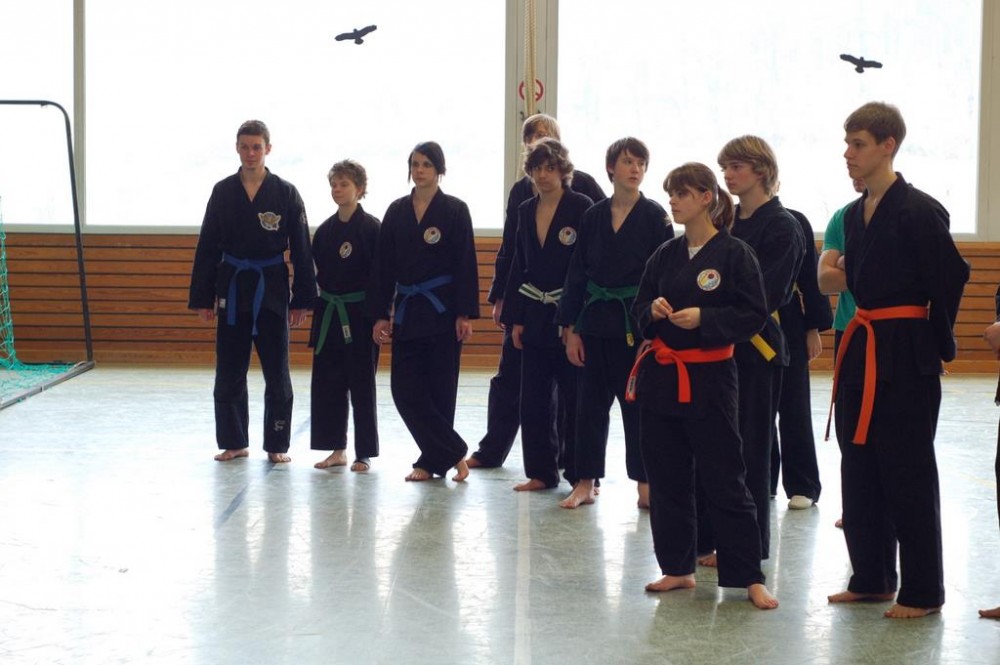 Währenddessen lernten die Erwachsenen ein interessantes, neues System kennen, welches von zwei auswärtigen Referenten vorgestellt wurde. Es hieß S.O.S (System Of Selfpreservation) und vermittelte einige Gedanken zur realen Selbstverteidigung auf der Straße. Nachmittags schlossen sich zwei weitere Einheiten zu diesem Thema an. Auch wenn alle überrascht waren angesichts der neuen Inhalte und auch wenn die Einheiten schließlich äußerst kontrovers diskutiert wurden, kann man letztlich sagen, dass das Ziel erreicht worden ist: Wir wurden mit einem völlig neuem System konfrontiert und dazu angeregt uns in den drei Einheiten und in den zahlreichen folgenden Gesprächen eine eigene Meinung zu bilden.