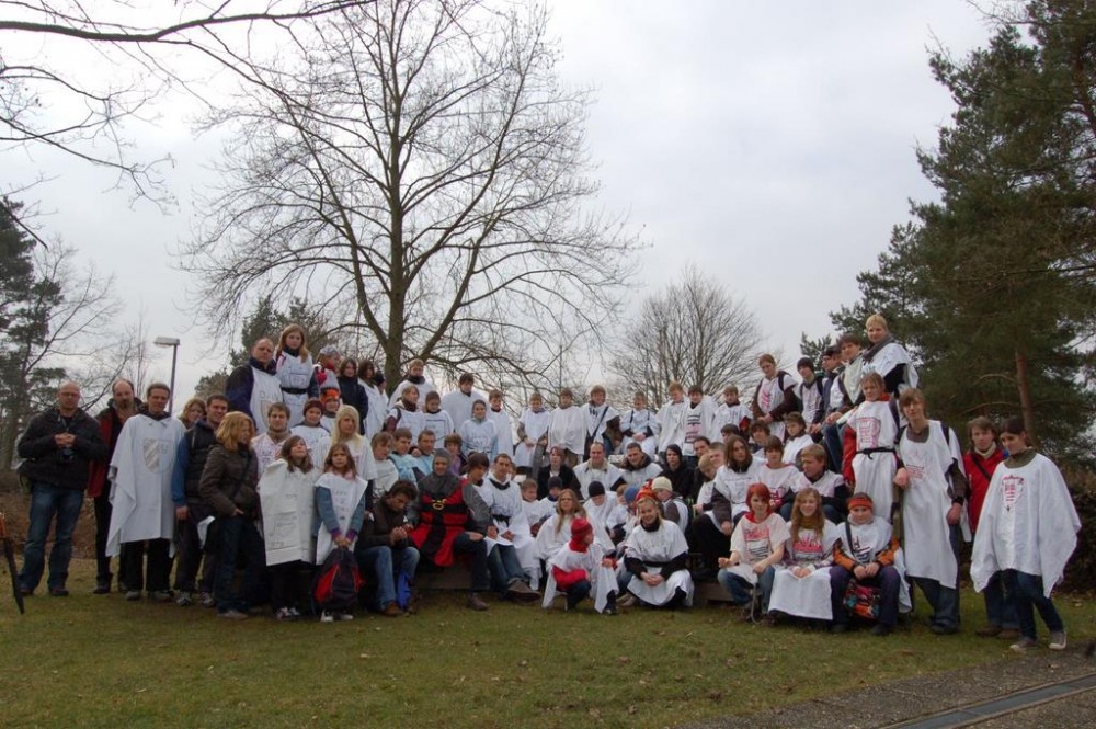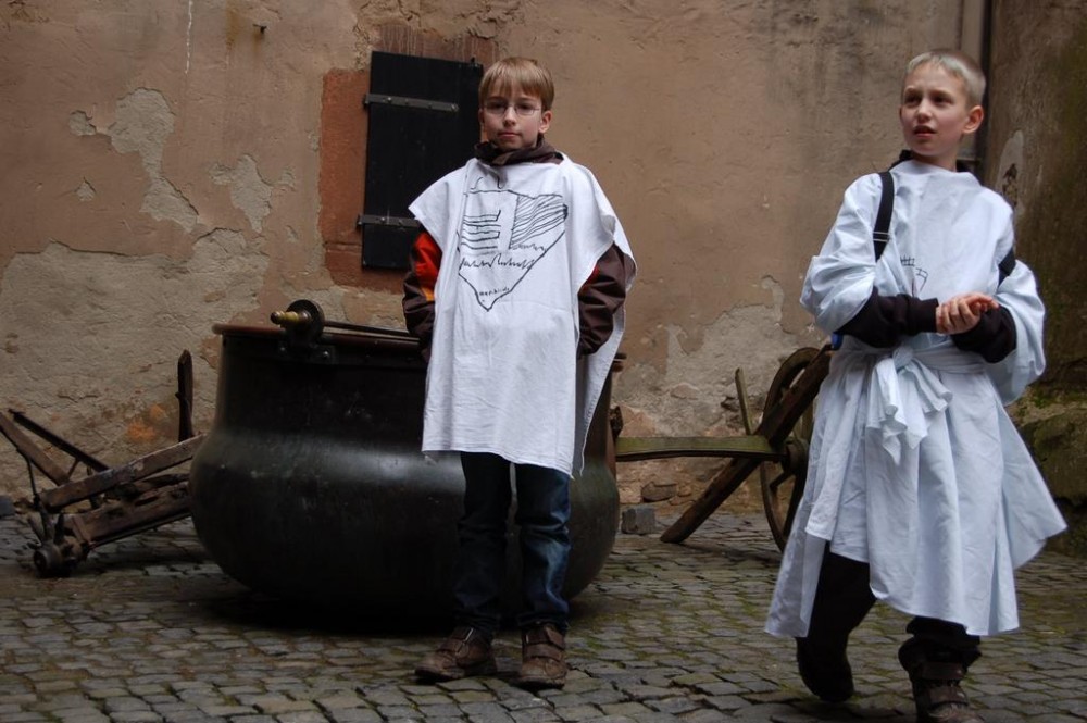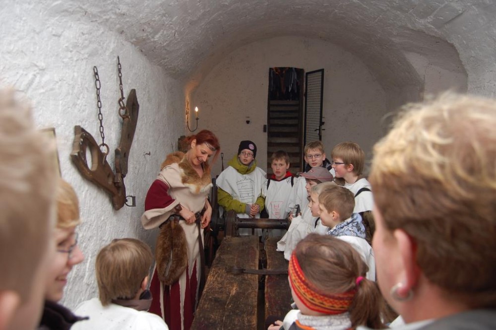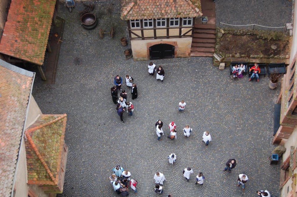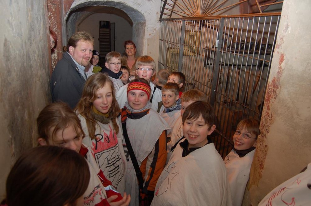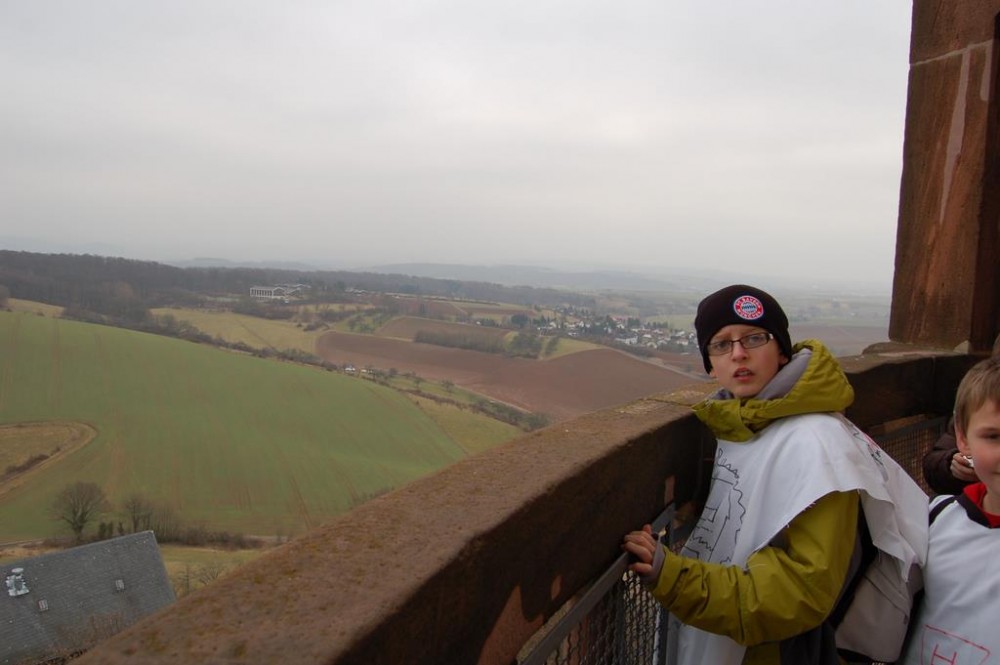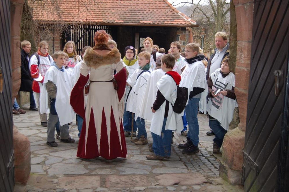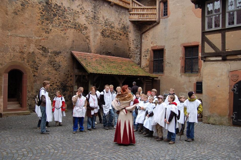 Mit Lunchpaketen ausgestattet wurde das Training am Samstagnachmittag für einige Stunden unterbrochen. Alle in unsere Rittergewande gehüllt, begaben wir uns auf die rund halbstündige Wanderung zur Ronneburg. Dort warteten vier Führer auf uns, die uns in vier Gruppen die mittelalterliche Burg nahe brachten. Besonders beeindruckend war der 96 Meter tiefe Brunnen, der ein unnachahmliches Echo widerhallte.