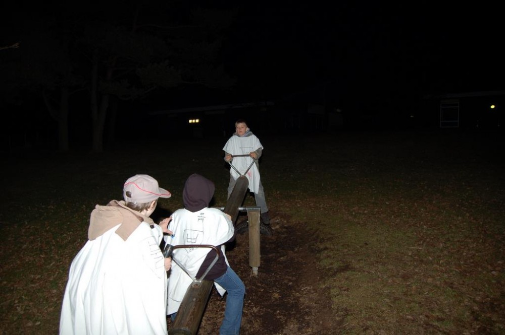 Auch wenn die Müdigkeit sich angesichts des langen Tages schon bei allen bemerkbar machte, war an Schlaf längst nicht zu denken. Wir versammelten uns zum großen Nachtspiel im Saal. Es galt die vier Elemente der koreanischen Flagge zu erkämpfen um Ritter Harald von der Ronneburg zu retten. Jedes Haus bildete ein Team und kämpfte fortan um sein Element. Auf dem weitläufigen Gelände waren vier Spielstationen aufgebaut, doch für jedes Haus gab es nur eine entsprechende Spielstation. Sobald man diese gefunden hatte, musste man jeweils paarweise einen Parcours überwinden, um anschließend das begehrte Stück der Flagge zu bekommen. Als alle vier Gruppen erfolgreich waren und ihre Fahnenstücke im Saal abgeliefert hatten, zog das ganze Teilnehmerfeld hinaus, um die Fahnenstücke Harald von der Ronneburg zu präsentieren, der an einem Lagerfeuer wartete. Dieser gab sich allerdings so einfach nicht zufrieden. Verschiedene Lieder, die an den vergangenen zwei Tagen eingeübt worden waren, mussten laut und einstimmig zum Besten gegeben werden. Nach einigen Anläufen gelang es- als Zeichen seiner Zufriedenheit entbrannte ein buntes Feuerwerk.
