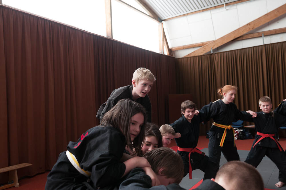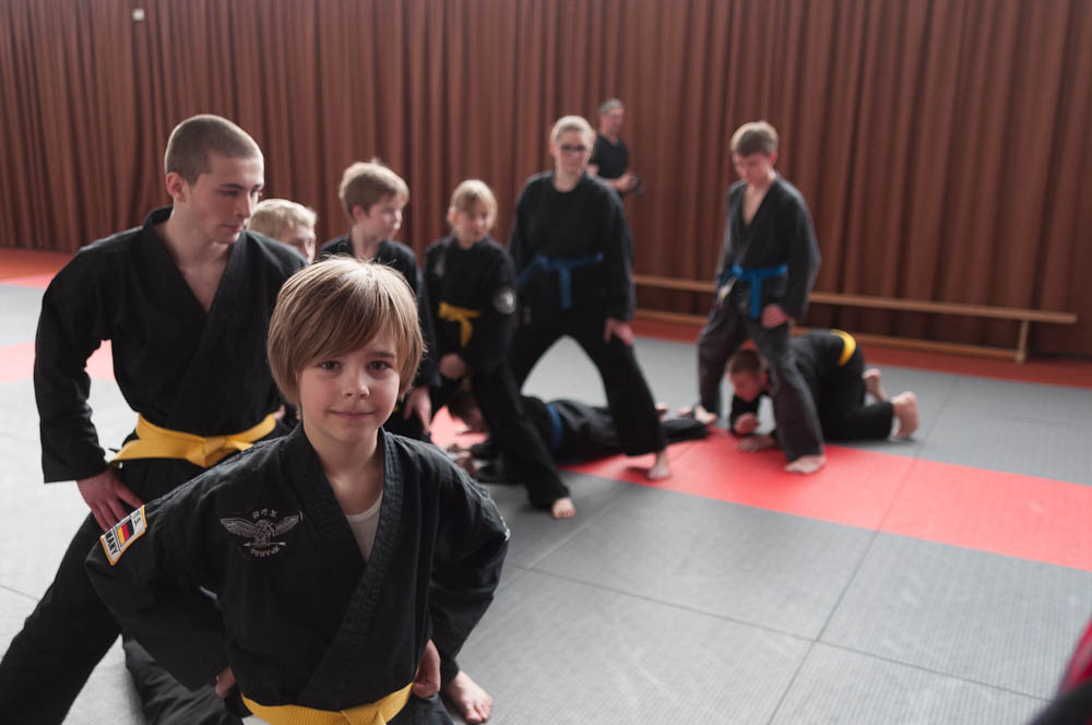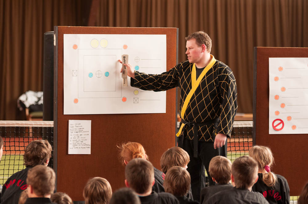 In der großen Pause erarbeiteten die Teilnehmer in Workshops verschiedene Aufgabengebiete rund ums Thema Kampf. Woraus besteht ein Kampfgericht? Wer wirkt alles mit? Welche Aktionen sind im Kampf verboten? Was bedeuten die koreanischen Kommandos und was ist zu tun? Diese Fragen mussten sich die Teilnehmer in Workshop stellen und gemeinsam erarbeiten. Alle waren mit sichtlicher Freude bei der Sache. Im Anschluss wurde in großer Runde mit allen die Ergebnisse an Flipchats besprochen und erläutert. Anschließend ging es in Übungskämpfen darum das Gelernte umzusetzen.