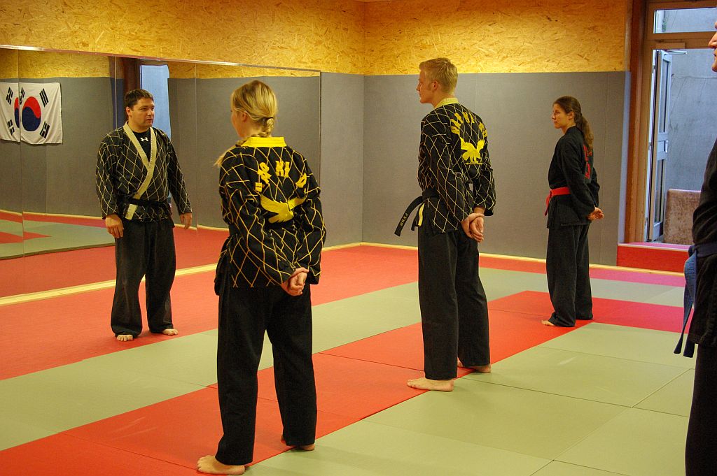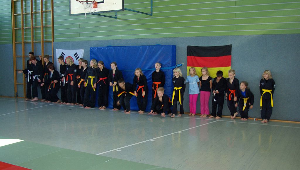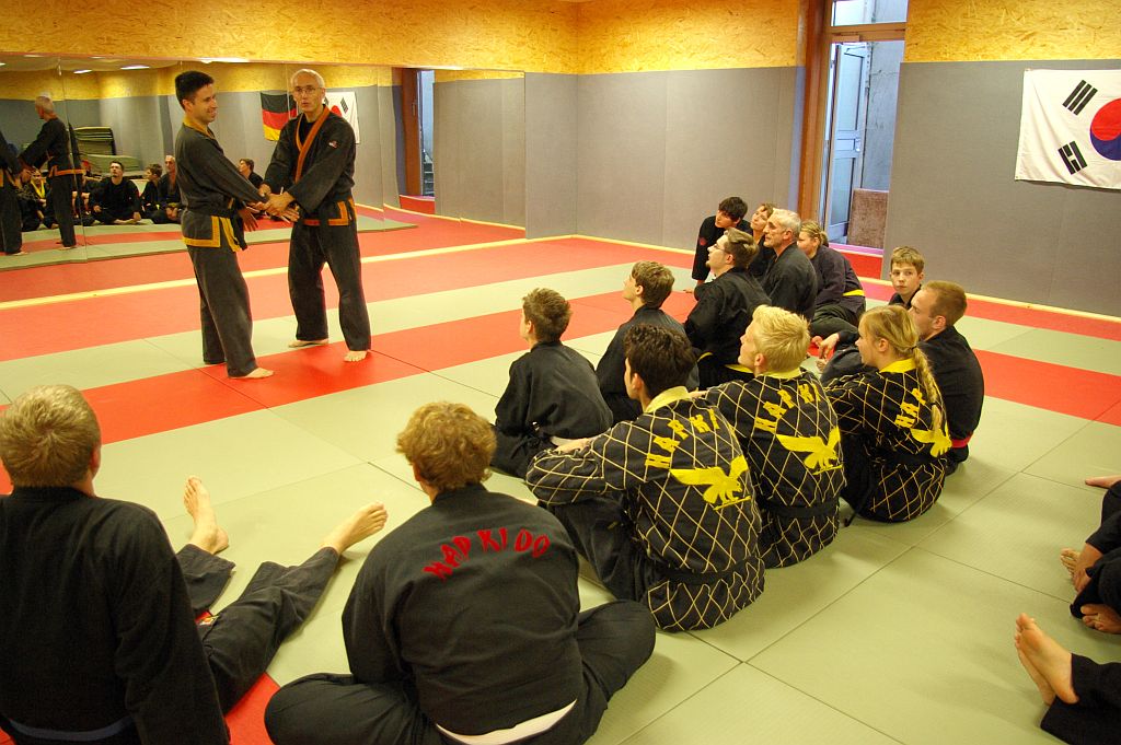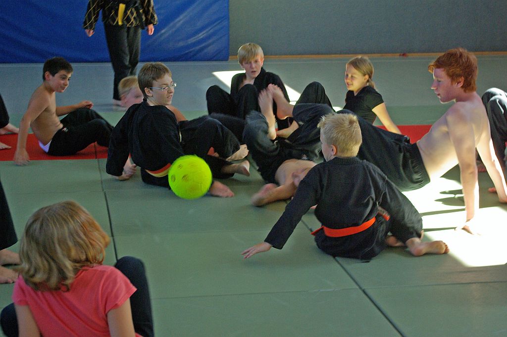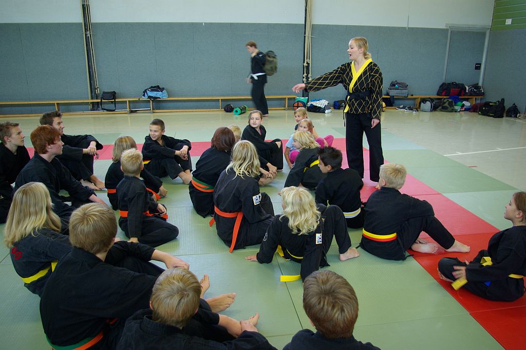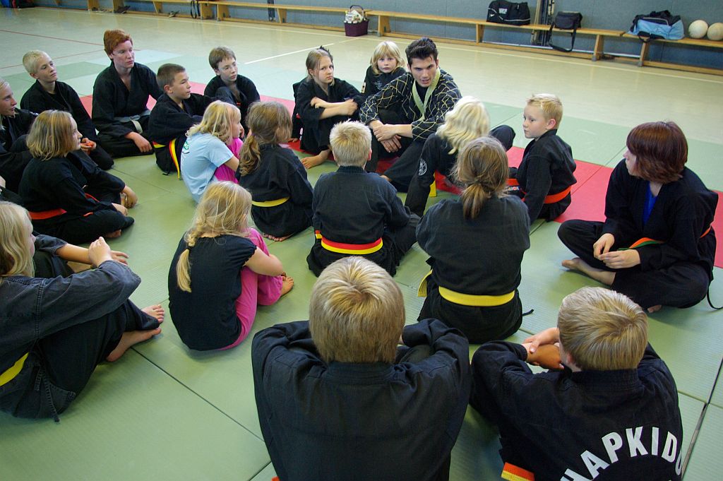 Der Samstag begann für die Jugend mit einer Übungseinheit, in der Anouscha Loza mit diesen spielerisch die Hapkidokreistheorie in praktische Bewegungen umsetzte. Sie lockerte die Übungen immer wieder gekonnt mit spielerischen Elementen auf, so dass niemand überfordert wurde und alle mit Spaß bei der Sache waren. Das zweite Thema des Tages waren Bodentechniken. Marcus Frenkel übte mit den Kindern grundlegende Elemente, bei denen sich alle ausgiebig bewegten und austoben konnten.