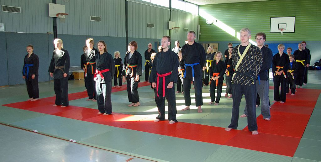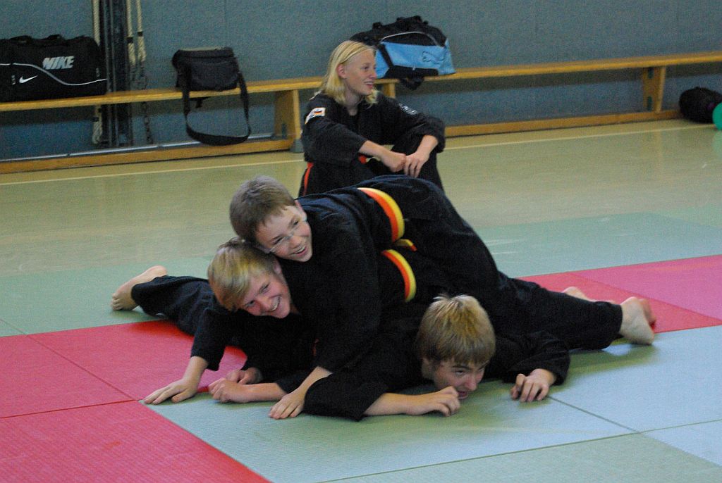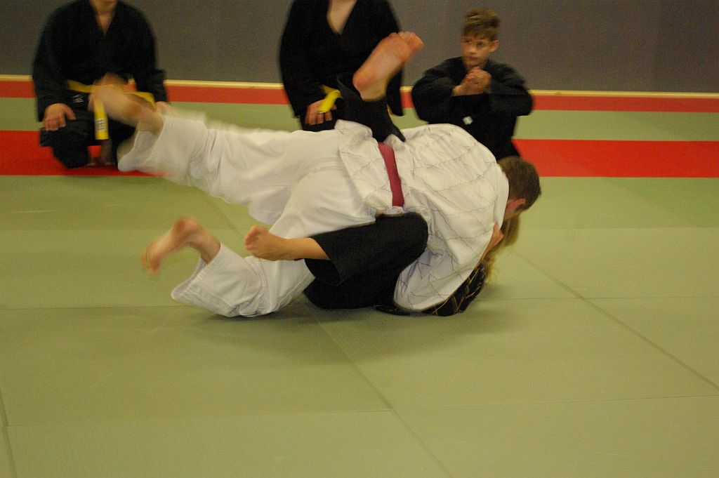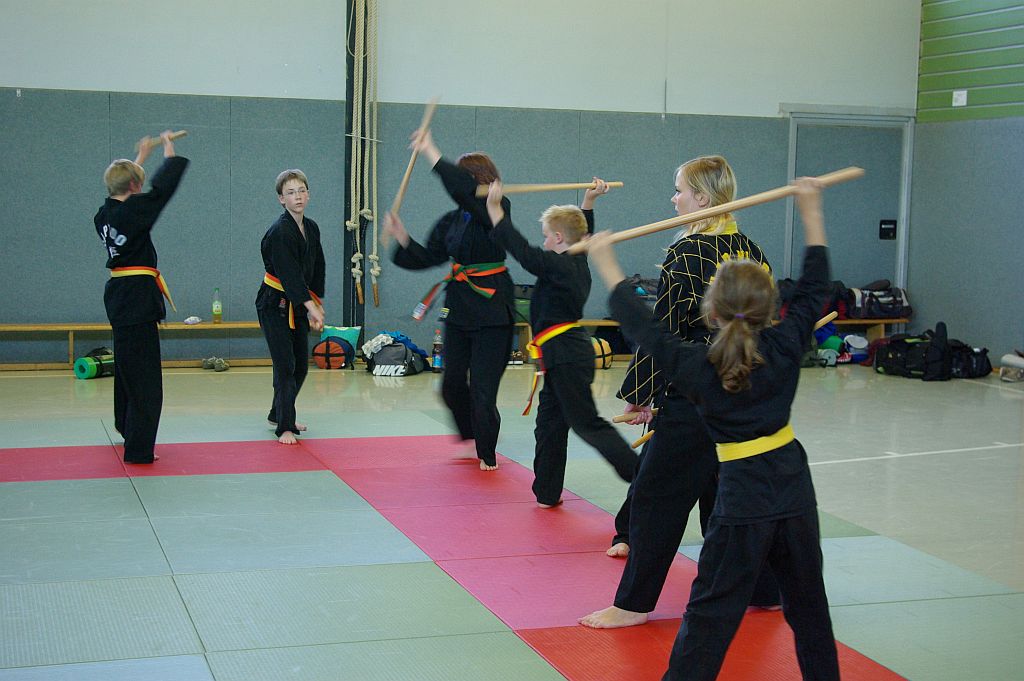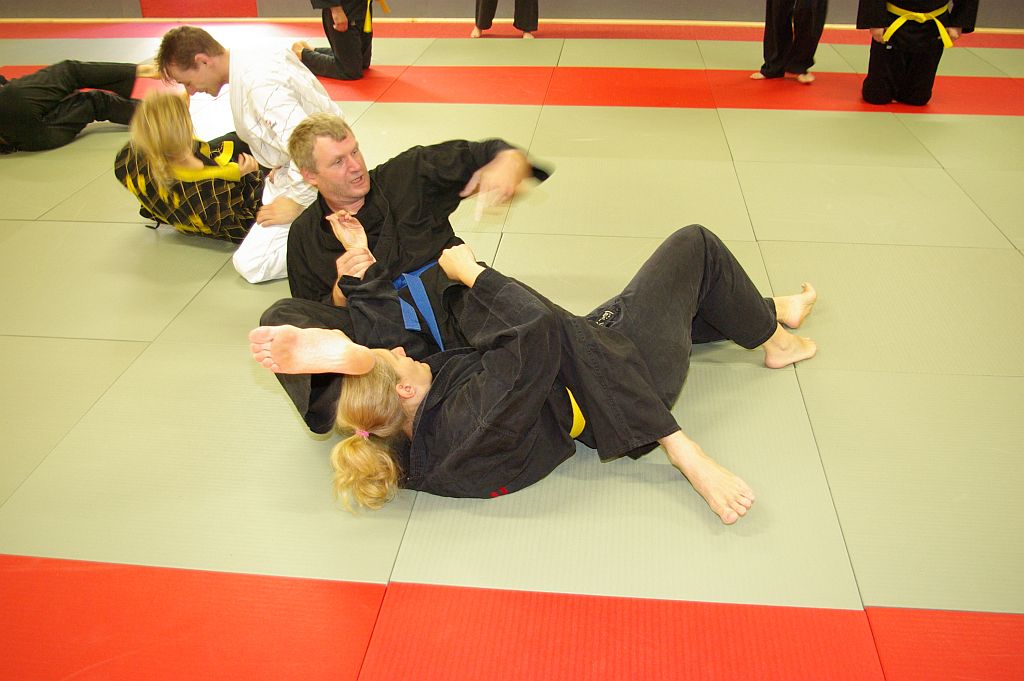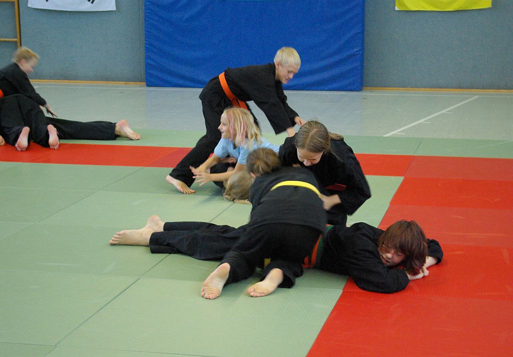Das Unterrichtsprogramm war für beide Übungsgruppen altersgemäß vorbereitet. Während die Jugend sich mit sehr viel Spiel und Spaß bei ihren Themen Fallschule und Bewegungslehre im Stand und am Boden abreagierten, reichte das Programm der Ältereren an beiden Tagen von Stocktechniken über Armhebel bis zum Bodenkampf.