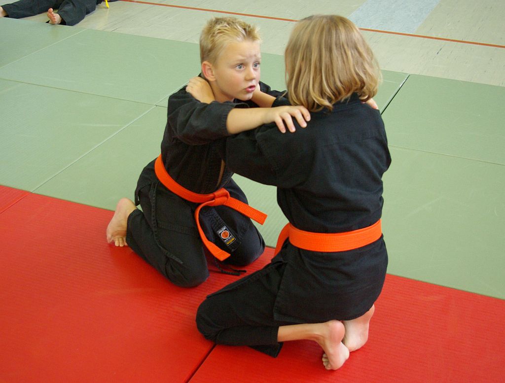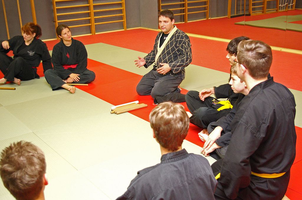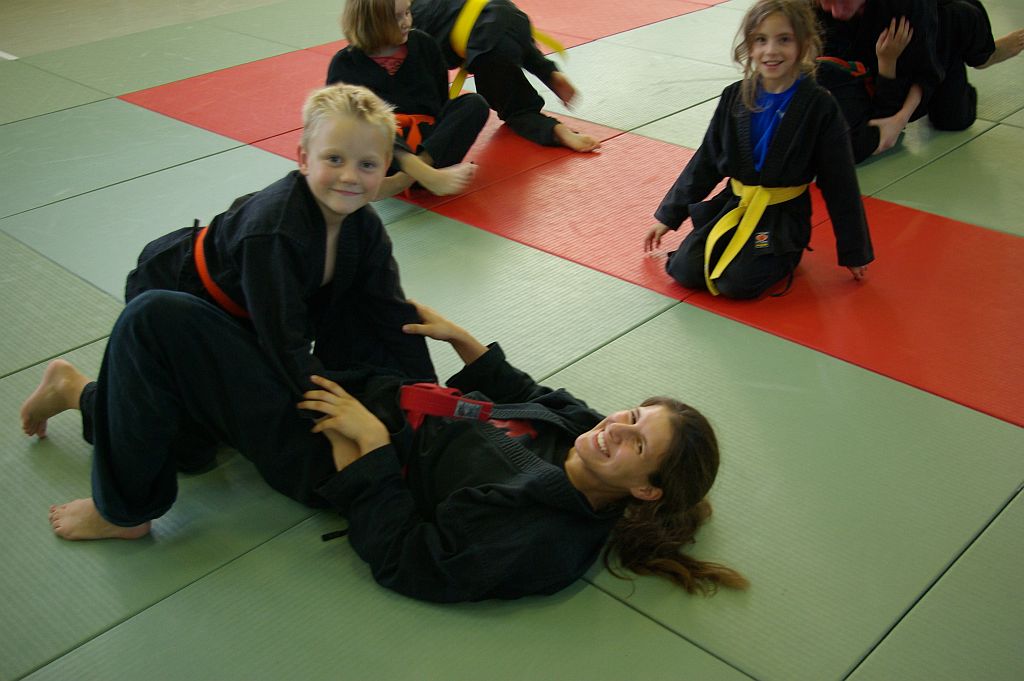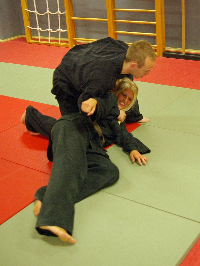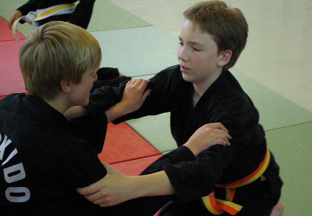 Das Unterrichtsprogramm war für beide Übungsgruppen altersgemäß vorbereitet. Während die Jugend sich mit sehr viel Spiel und Spaß bei ihren Themen Fallschule und Bewegungslehre im Stand und am Boden abreagierten, reichte das Programm der Ältereren an beiden Tagen von Stocktechniken über Armhebel bis zum Bodenkampf.