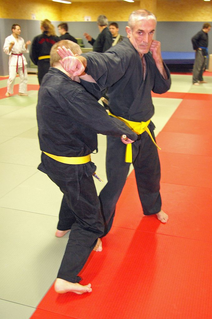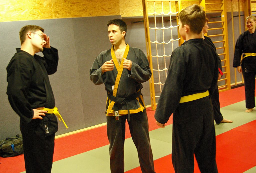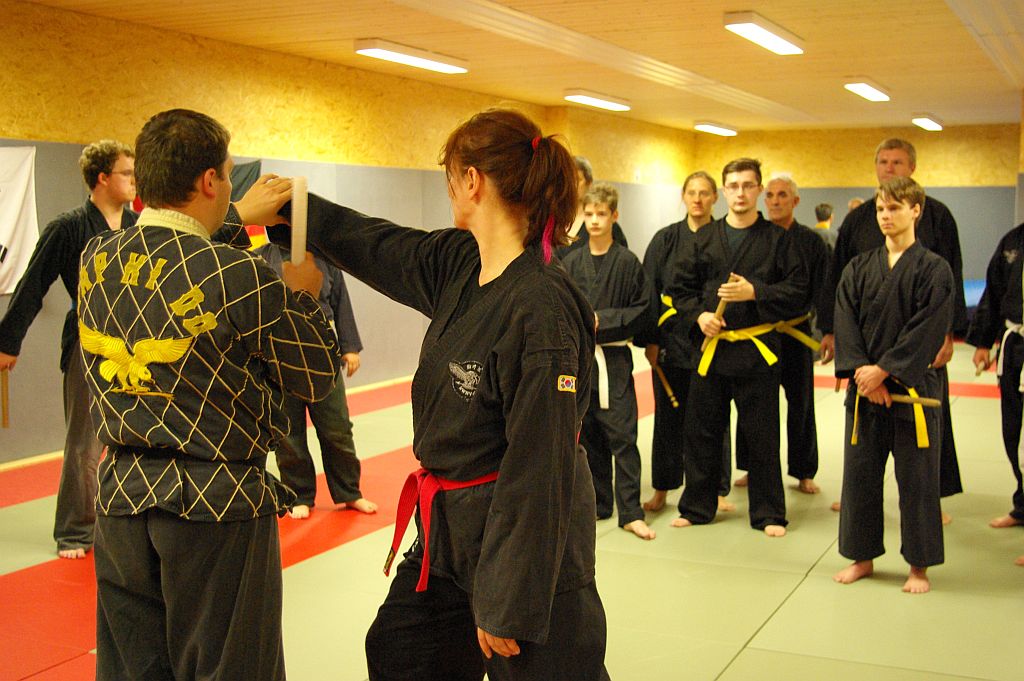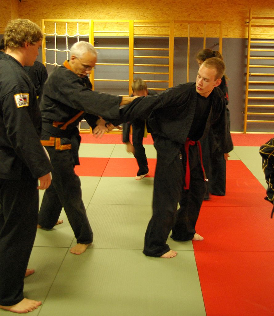 Die Senioren hatten in ihren Übungseinheiten als erstes Techniken mit dem Tan-Bong. Hier begann David Brucholder nach einer Aufwärmphase mit Grundtechniken und Gewöhnungsübungen zum Umgang mit dem Stock, danach folgten Anwendungen in der Selbstverteidigung. Die zweite Übungseinheit hatte den Armstreckhebel zum Thema, eine unserer Basishebeltechniken. Patrick Behrend und Mile Stoilov zeigten zahlreiche Varianten dieser Technik, und verblüfften immer wieder mit neuen Kombinationen, so dass es trotz drei Stunden intensiven Übens niemanden langweilig wurde.