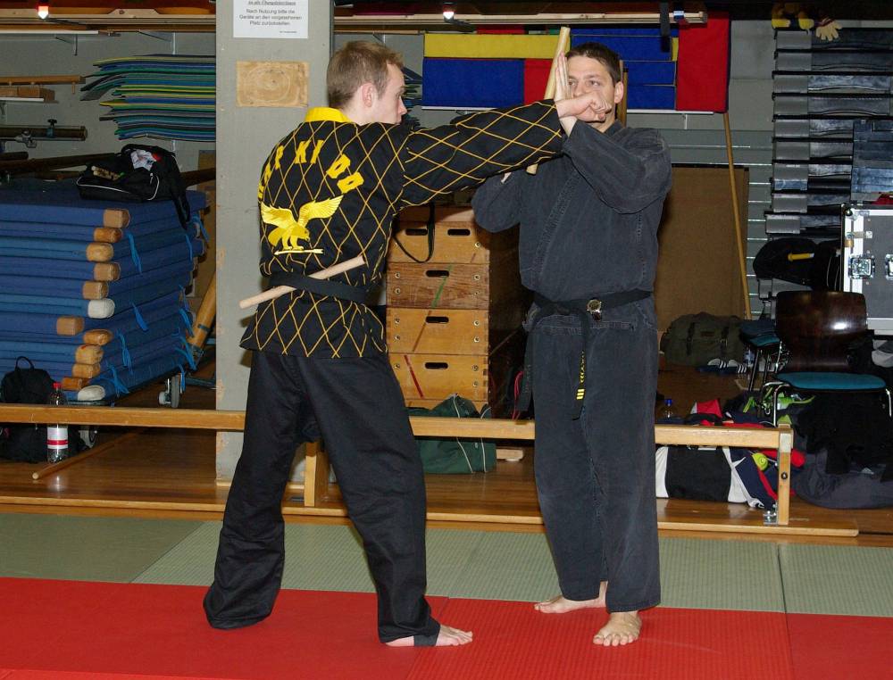 Im Schwerpunkt dieses Teils zeigte David dann Grundtechniken. Die Teilnehmer trainierten verschieden Blöcke und Schläge. Beim Üben mit dem Partner wurde auch schnell klar, dass bereits kleine Fehler in der Handhaltung Schmerzen im Handgelenk verursachen können. Der Langstock, der beim Zuschauen so einfach zu handhaben scheint, bewahrheitet die bekannte Regel: Nur Übung macht den Meister. Abschließend übten die Teilnehmer einen sogenannten Stern, eine einfache Kombination, die kontinuierlich in vier Richtungen ausgeführt werden kann. David zeigte ein hier Beispiel der vielfältigen Möglichkeiten. Insgesamt ein erfolgreicher Einblick in den Stockkampf.