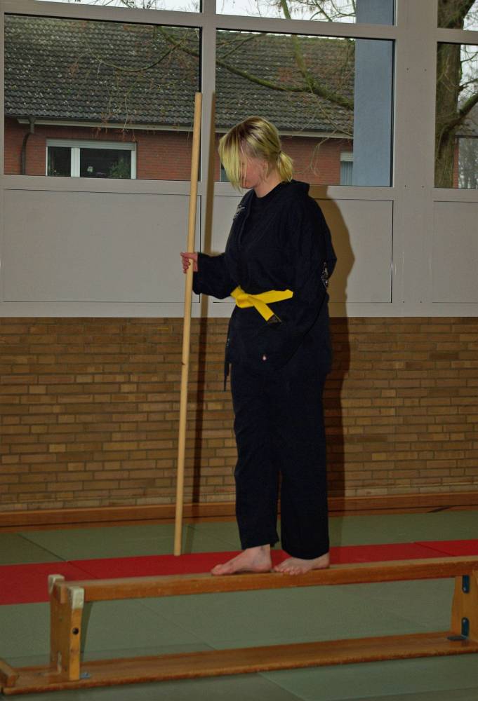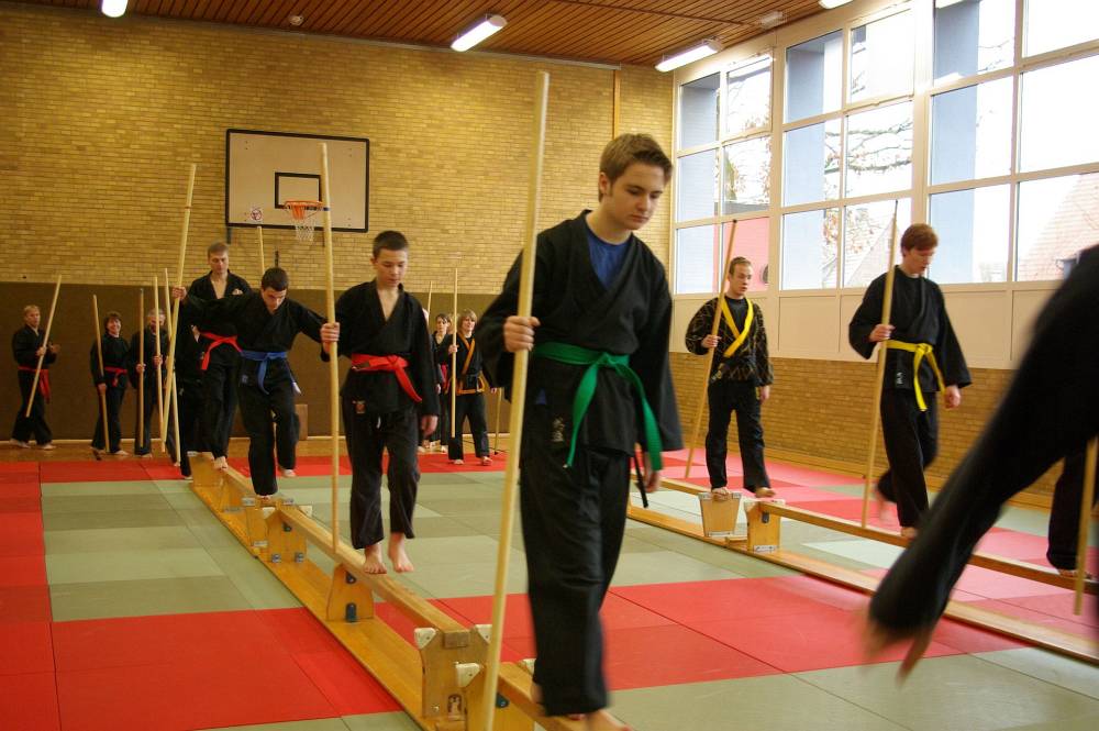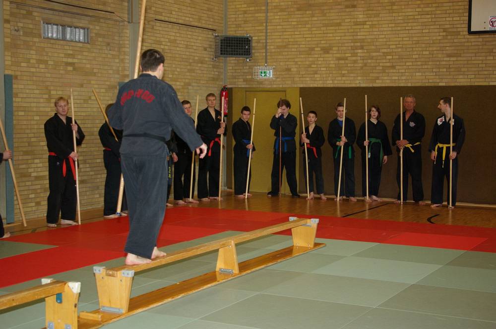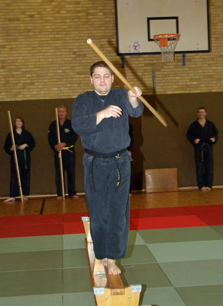Dann folgte das Rotieren des Stockes erst in einer Hand, und dann in beiden Händen. Diese schon fast artistisch wirkenden schnellen Drehungen, die man auch häufig in Martial Arts Filmen zu sehen bekommt, sind eigentlich keine geeigneten Kampftechniken, sondern dienen in erster Linie dazu, eine Handhabungssicherheit und ein Gefühl für den Stock zu erlangen. Was bei David so spielerisch einfach aussah, zeigte sich dann doch als schwieriger wie gedacht. Auch Davids lockere Bemerkung: „Stock fallen lassen gibt Kraft in den Armen!“ war nicht nur so daher gesagt. Das bekamen dann fast alle mehrmals zu spüren, denn jedes Fallenlassen der Waffe wurde mit „freiwilligen fünf Liegestützen belohnt“. Die Gleichgewichtsübung mit dem Partner auf umgedrehten Bänken führte dann doch einige Hapkidoin an ihre Grenzen.