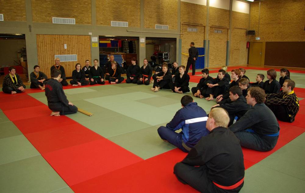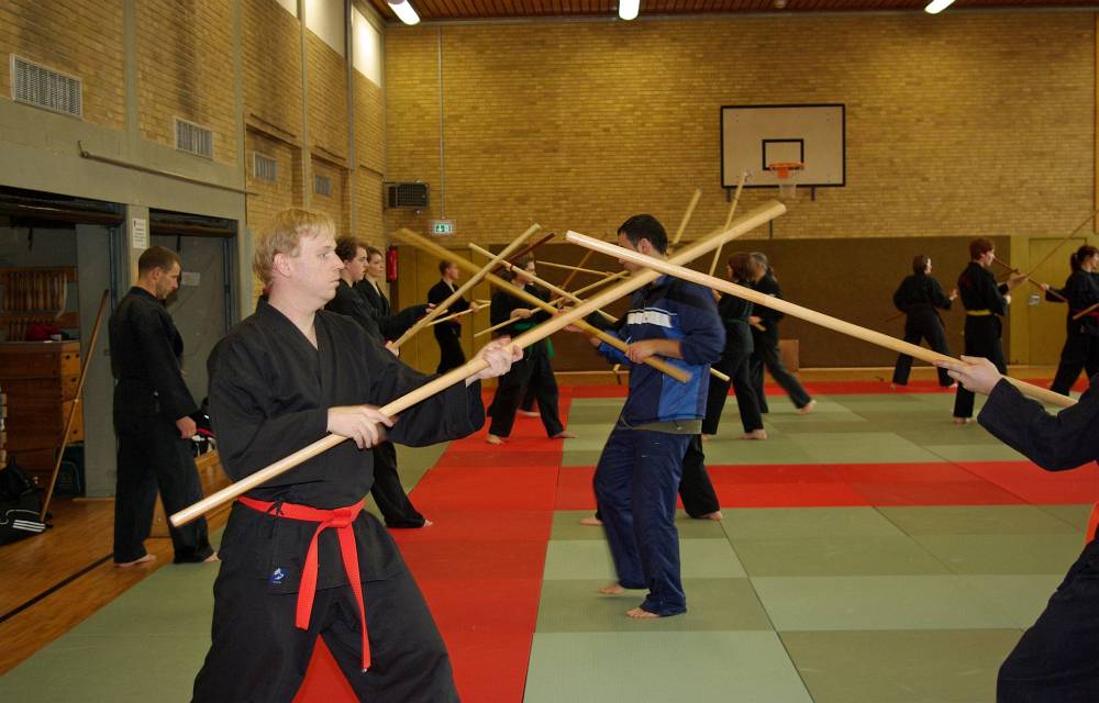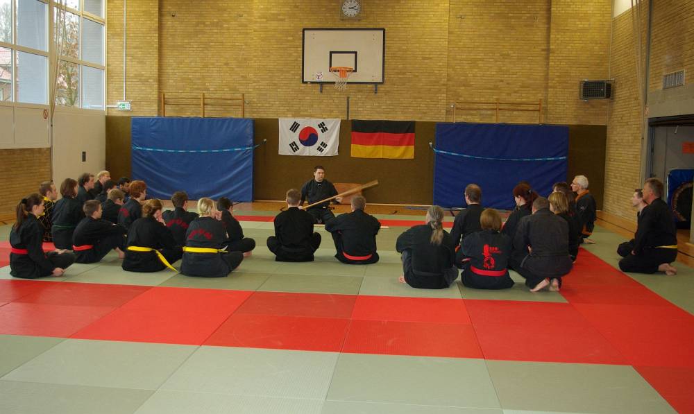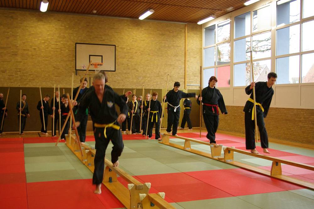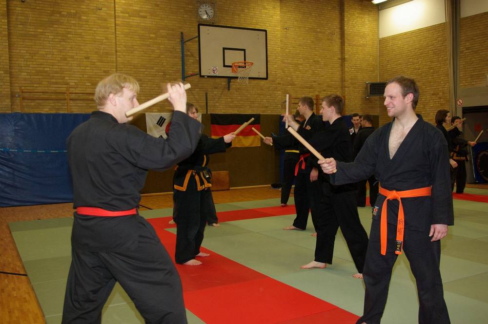 Der erste Landeslehrgang im neuen Jahr lockte über 30 Hapkidoin ins winterliche Clarholz. Unser Lehrwart David Bruchholder, 3. Dan, hatte Techniken mit dem Lang- sowie mit dem Kurzstock als Lehrgangsthema ausgeschrieben und übernahm auch selbst die Leitung. Im ersten Lehrgangsteil stand der Langstock auf dem Programm. Schon die Gymnastik erfolgte mit der Waffe in der Hand, um beim Aufwärmen gleichzeitig zu erreichen, dass sich jeder an den Umgang mit dem langen Stock gewöhnen konnte.