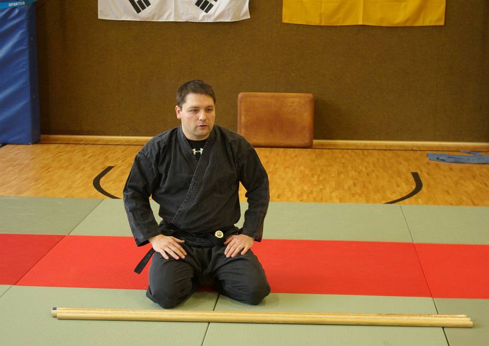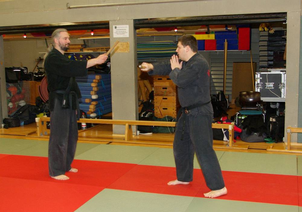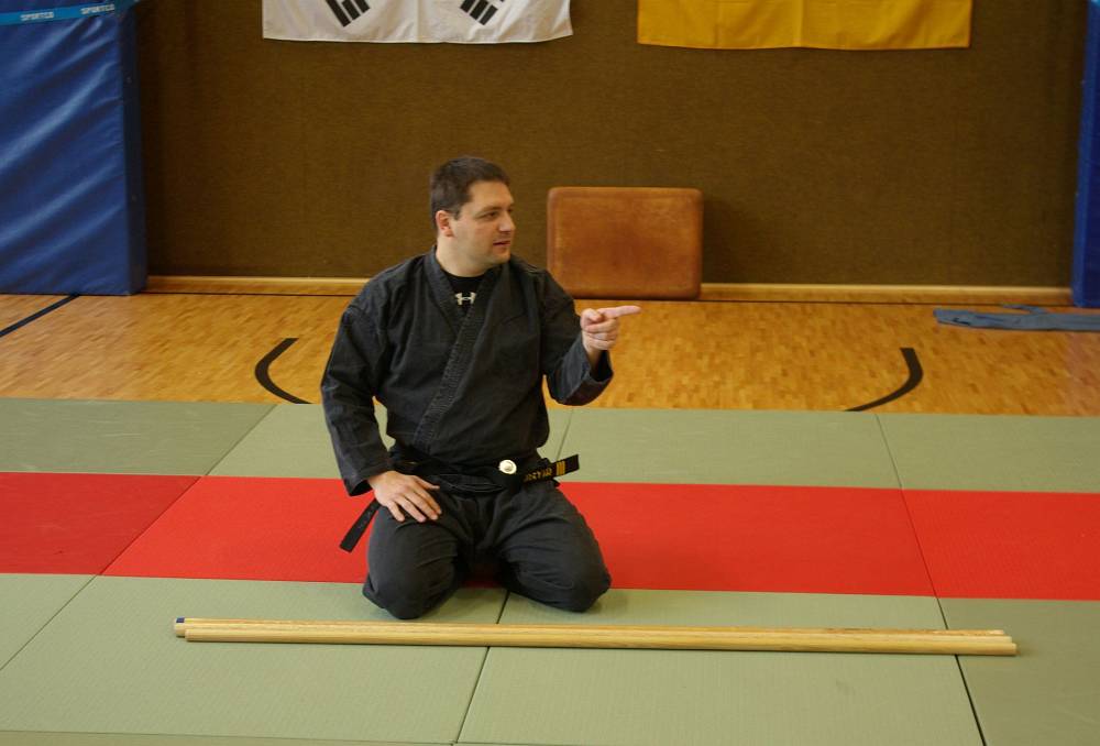 Die darauf folgenden Übungsbeispiele an Wurf- und Hebeltechniken unter Verwendung des Kurzstockes machten den Einsatz dieser Waffe im Hapkido deutlich. David nutzte hierzu wie im letzten Jahr einige Techniken aus dem Prüfungsprogramm zum zweiten Dan. Der Kurzstock bietet selbstverständlich noch zahlreiche, über dem Prüfungsprogramm hinausgehende Anwendungsmöglichkeiten. Zum Abschluss des interessanten Tages gab es die erste Sequenz einer Kurzstock-Hyong, um einen Anreiz zu geben, sich mehr mit dieser Waffe zu beschäftigen. Am Ende waren alle Teilnehmer dankbar, dass sie die Möglichkeit hatten, einen Blick über den Tellerrand des Hapkido hinaus werfen zu können.