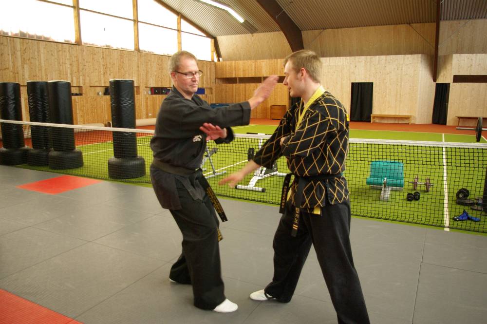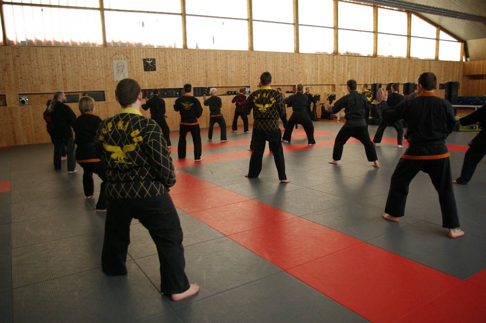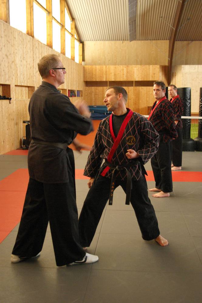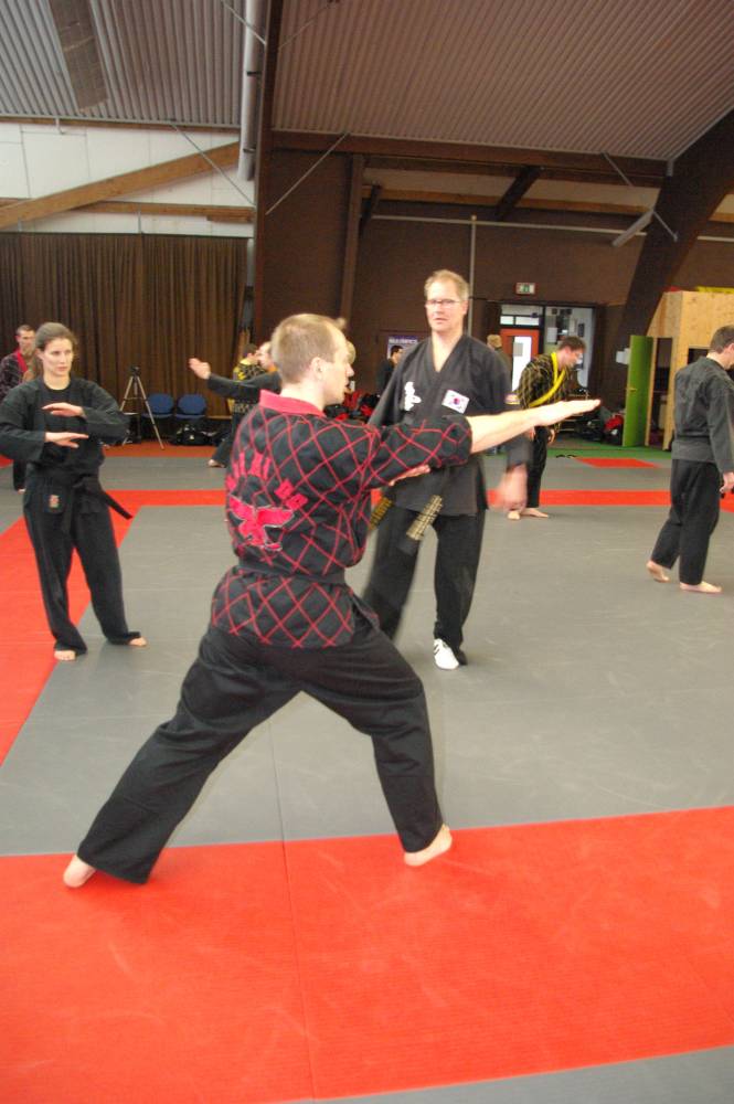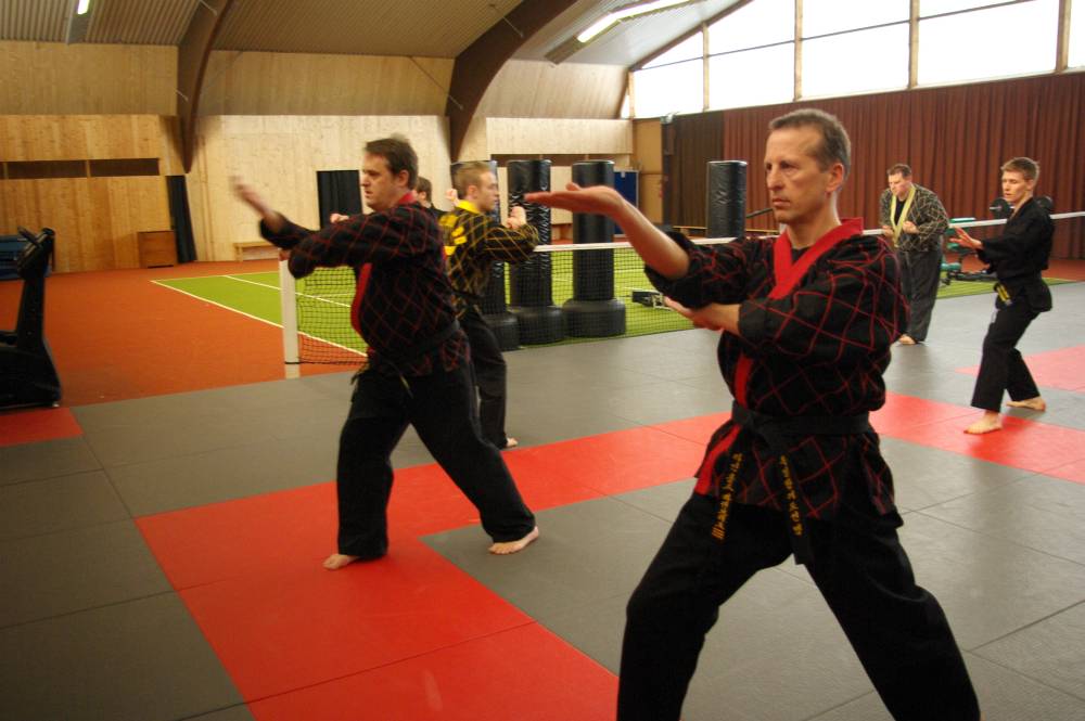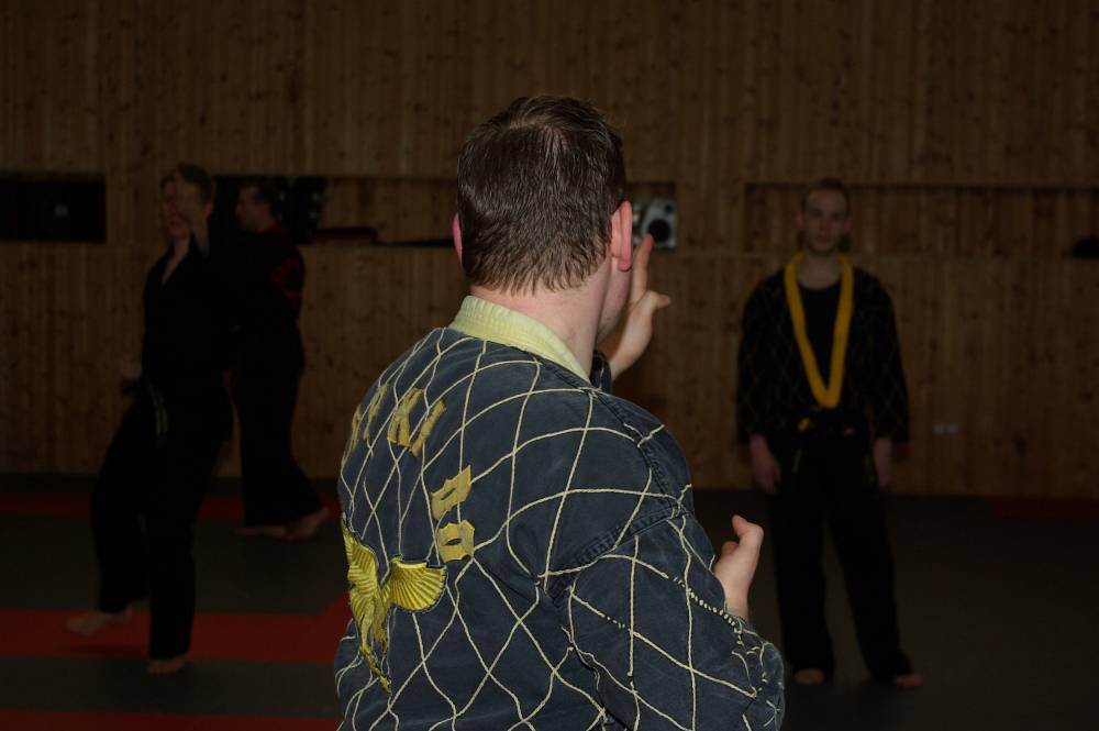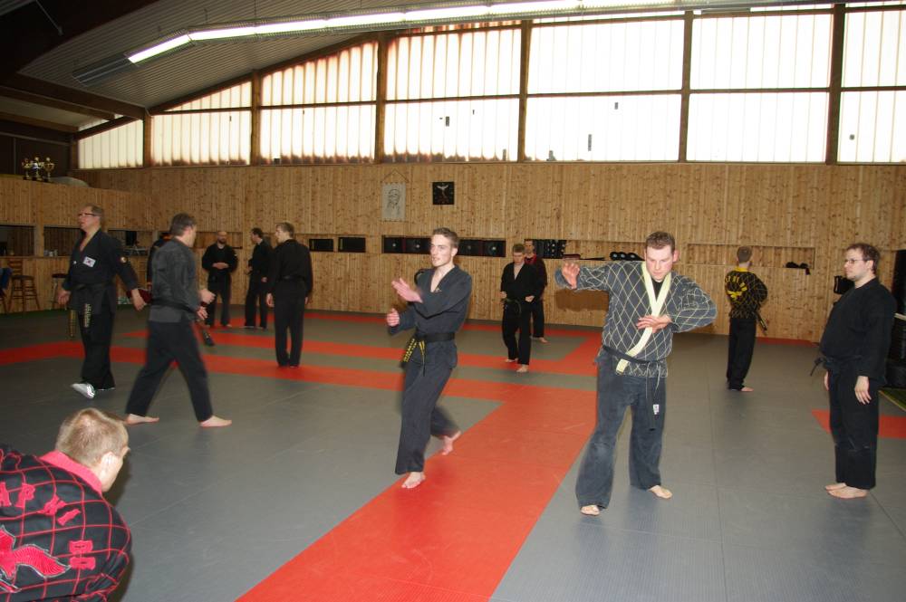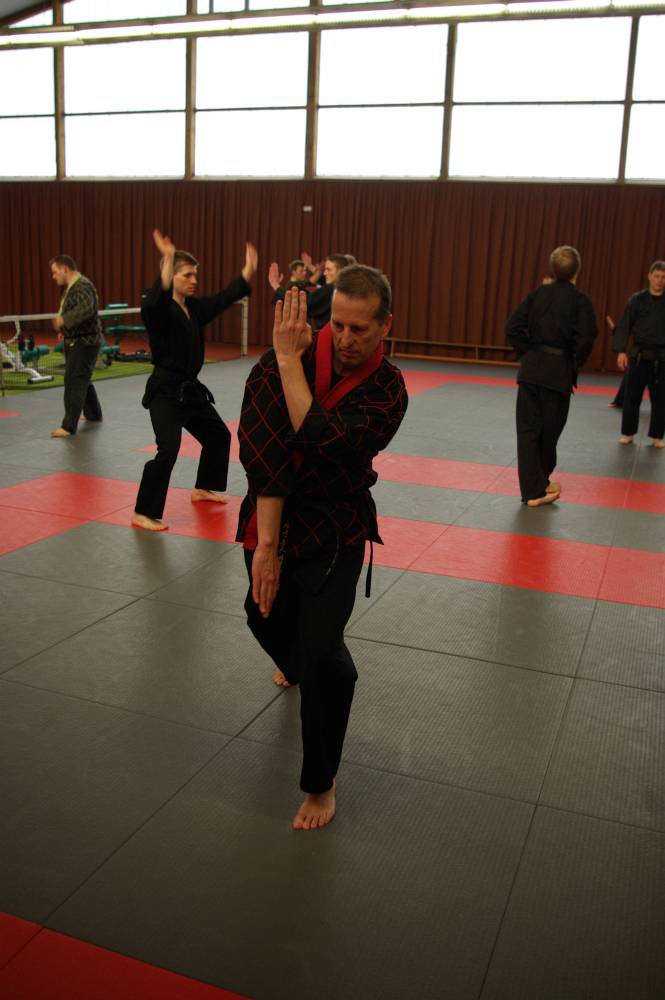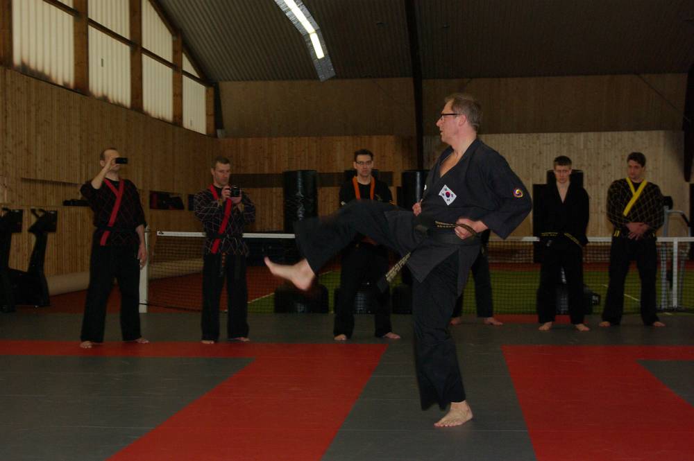 Frank zeigte die Hyong in der heute in Korea praktizierten Form. Er ging sie mit allen Teilnehmern komplett in ihren sechs Abschnitten durch. Zu jeder Technik erklärte er die Bedeutung und zeigte am Partner deren Anwendung. So war jedem Übenden schnell klar, warum diese Technik an dieser Stelle genau so ausgeführt werden soll. Dabei blieb immer für alle ausreichende Zeit zum Üben. Ein anstrengender Nachmittag, sowohl für Körper als auch für den Geist. Denn obwohl, oder gerade weil die Form in den Grundzügen bekannt war, mussten doch die sich ergebenden Änderungen verinnerlicht werden. Insgesamt für alle ein fordernder, aber auch erfolgreicher Nachmittag. Der Dank gilt dem Referenten, der sich unermüdlich um jeden einzelnen bemühte. So hat diese Form im NWHV wieder den Anschluss an die koreanische Ausführung gefunden und ist bei den nächsten Danprüfungen in dieser Art zu laufen.