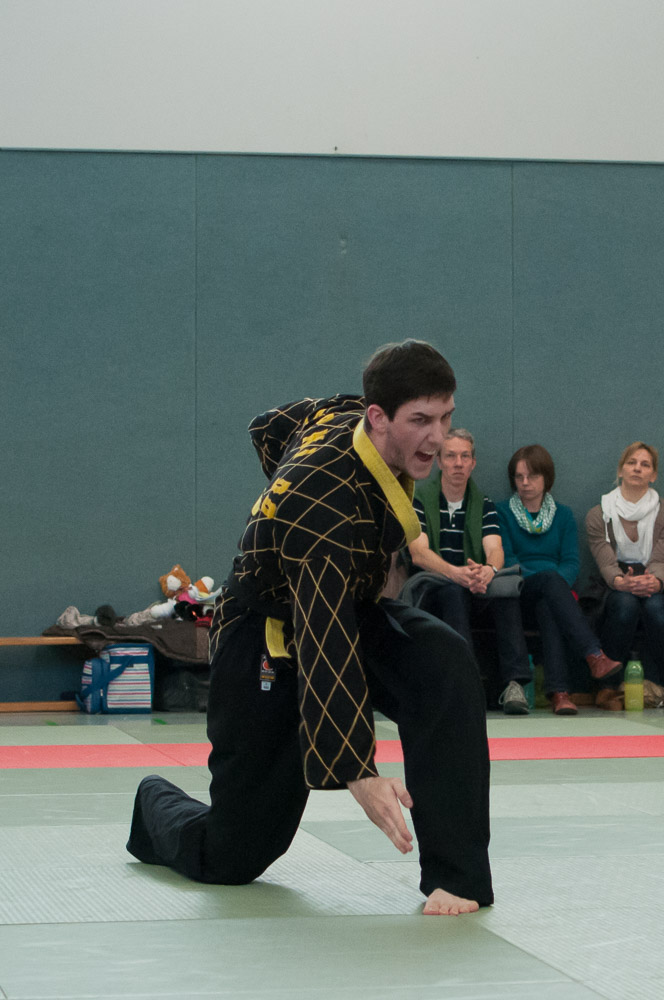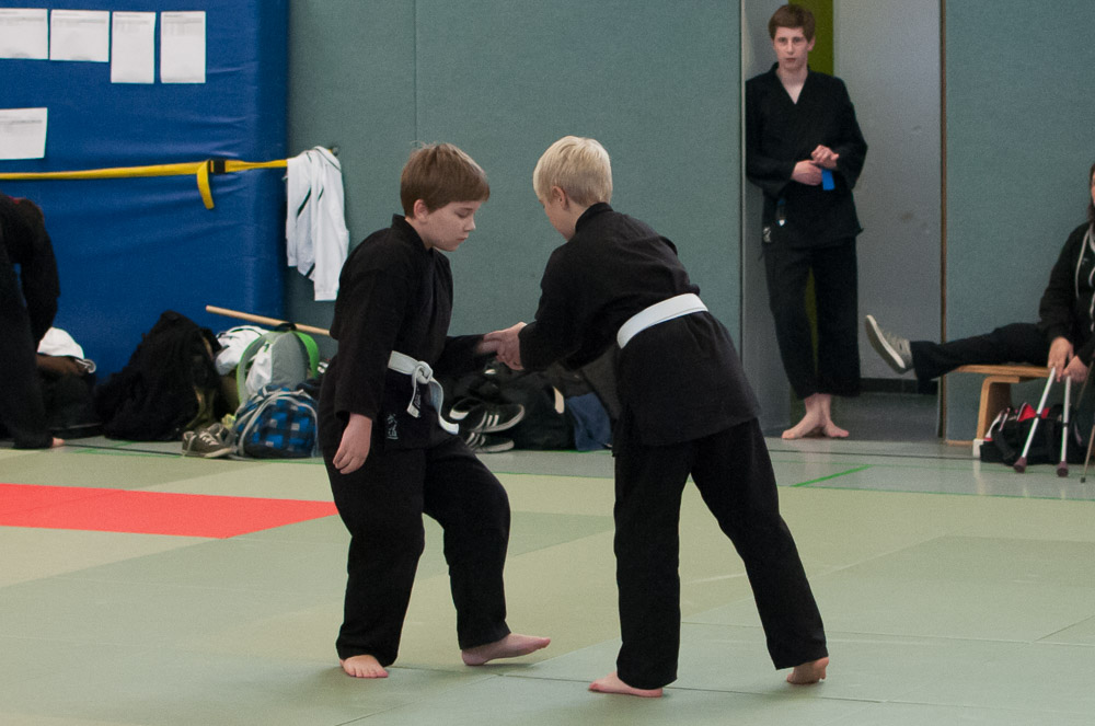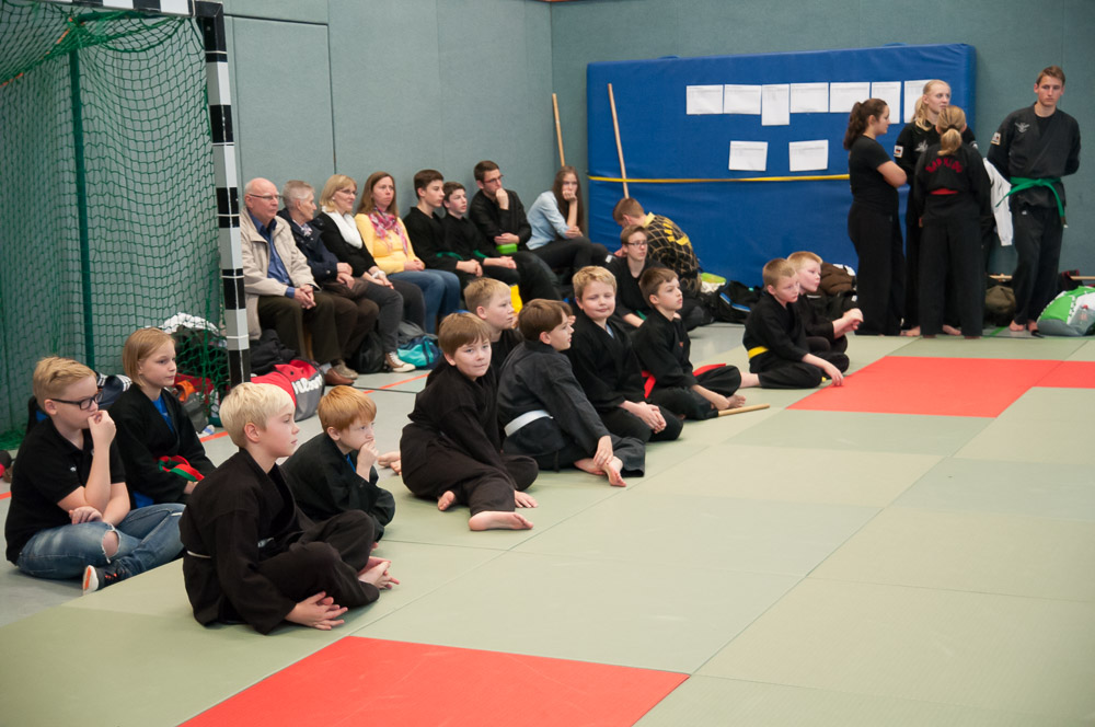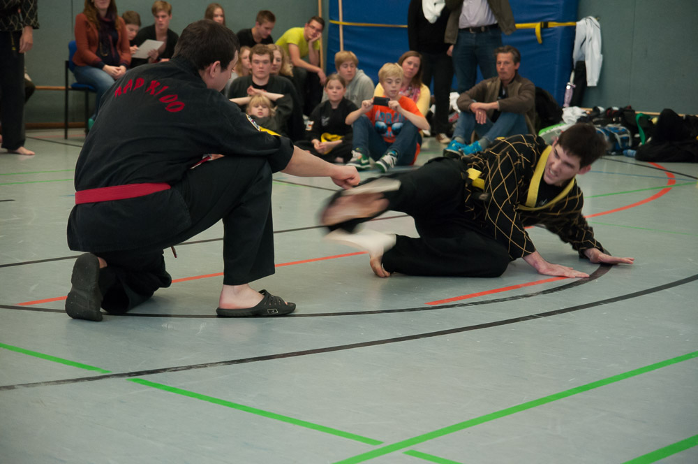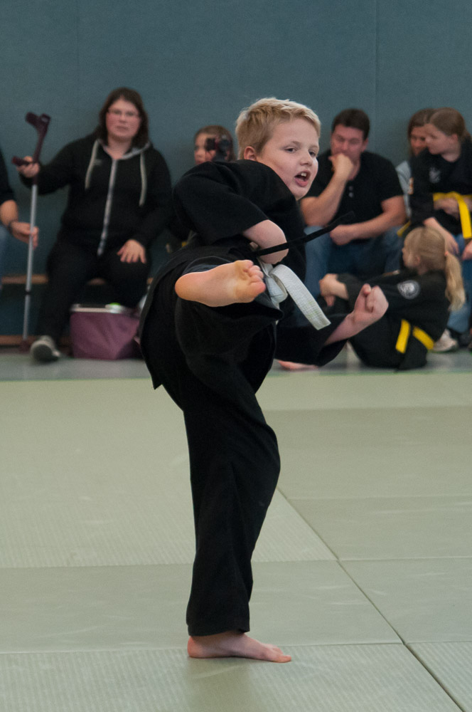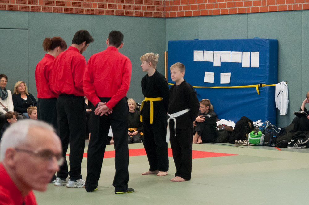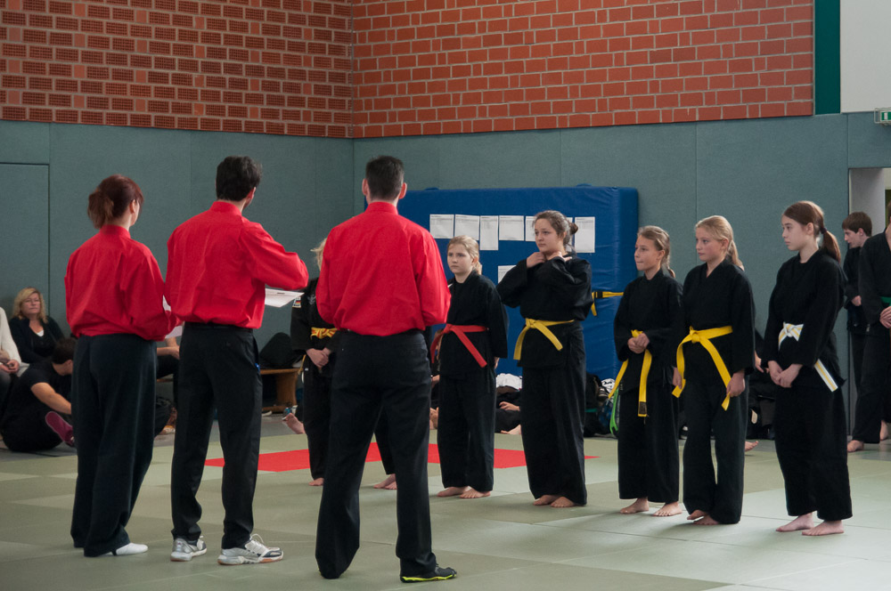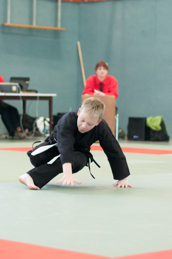 Der Vormittag stand im Zeichen der Selbstverteidigung. Bei der Jugend konnten die zahlreichen Zuschauer durchweg gute Leistungen sehen. Die jungen Teilnehmer mussten zunächst in einer ersten Runde sieben vorgegebene Techniken aus den Bereichen Fallschule, Fußtechniken und Hoshinsul demonstrieren. Nach der Auszählung der Punkte, die von den Wertungsrichtern in geheimer Bewertung erfolgte, hatten dann die Teilnehmer in der Reihenfolge ihrer Platzierungen sieben frei gewählte Techniken vorzuführen. Es macht immer wieder Freude festzustellen, mit welchem Eifer und Ernst unsere Kleinsten an den Start gehen Deshalb war es auch gerechtfertigt, dass jeder Teilnehmer zur Bestätigung seiner Leistung vom Landesjugendleiter Tobias Lohre eine Urkunde ausgehändigt bekam.