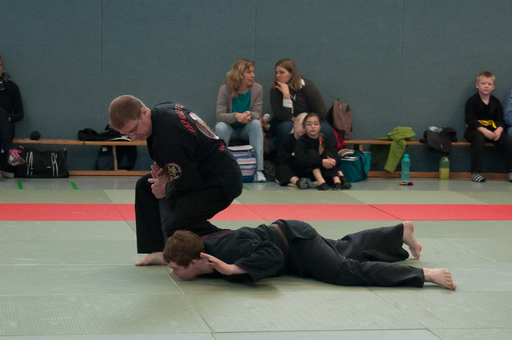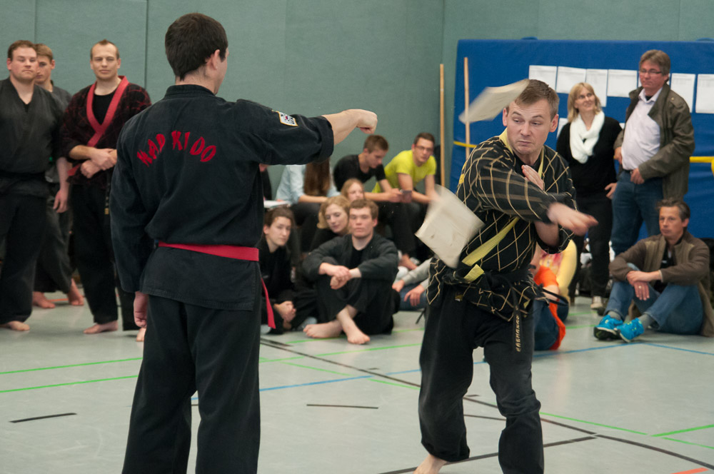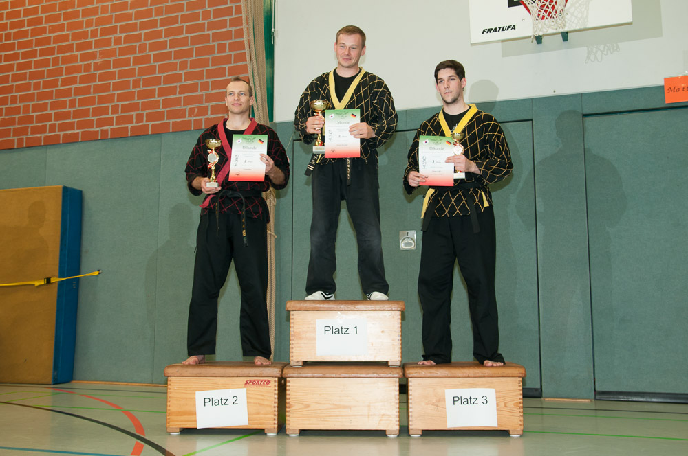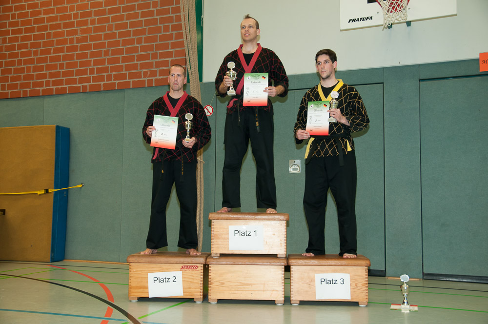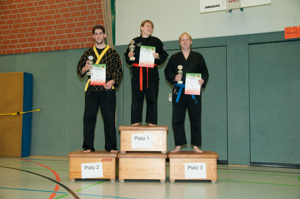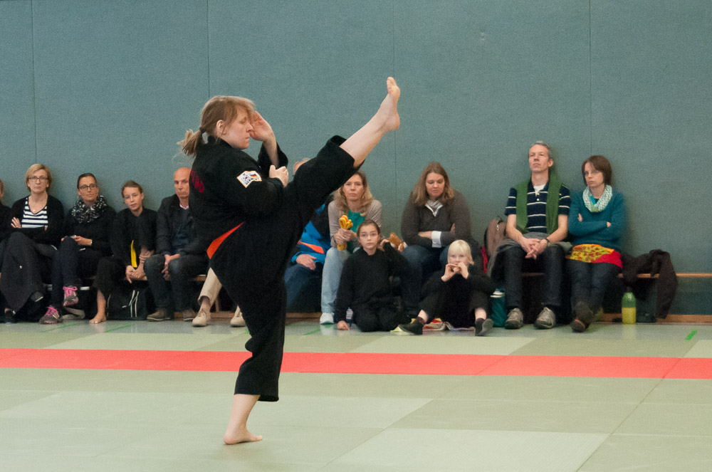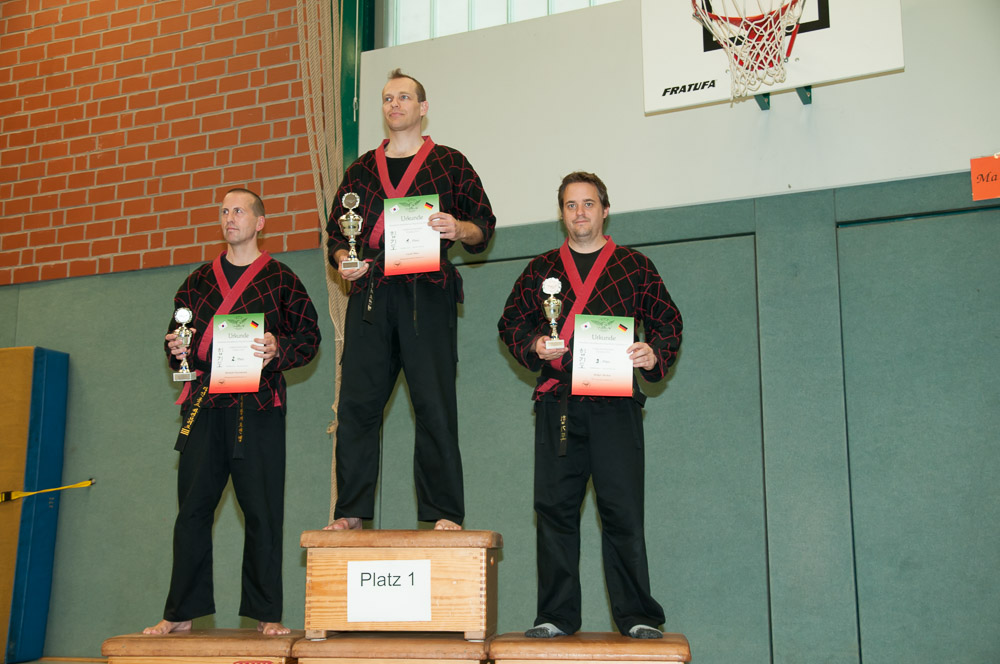 Der Vormittag stand im Zeichen der Selbstverteidigung. Bei der Jugend konnten die zahlreichen Zuschauer durchweg gute Leistungen sehen. Die jungen Teilnehmer mussten zunächst in einer ersten Runde sieben vorgegebene Techniken aus den Bereichen Fallschule, Fußtechniken und Hoshinsul demonstrieren. Nach der Auszählung der Punkte, die von den Wertungsrichtern in geheimer Bewertung erfolgte, hatten dann die Teilnehmer in der Reihenfolge ihrer Platzierungen sieben frei gewählte Techniken vorzuführen. Es macht immer wieder Freude festzustellen, mit welchem Eifer und Ernst unsere Kleinsten an den Start gehen Deshalb war es auch gerechtfertigt, dass jeder Teilnehmer zur Bestätigung seiner Leistung vom Landesjugendleiter Tobias Lohre eine Urkunde ausgehändigt bekam.