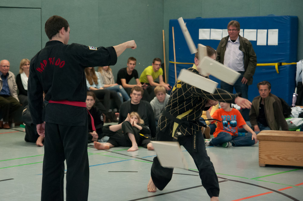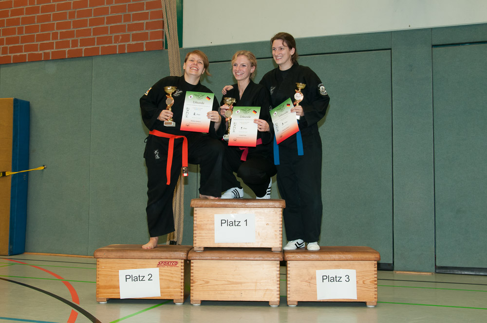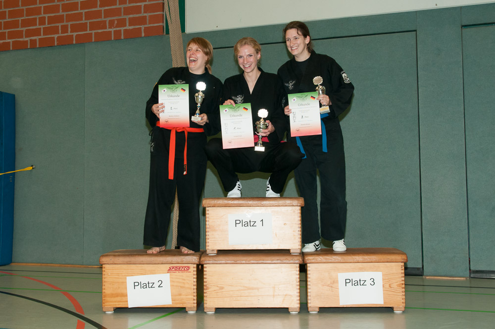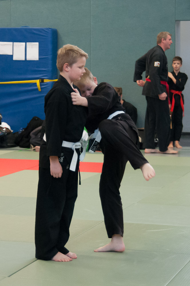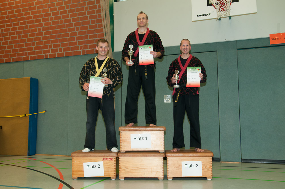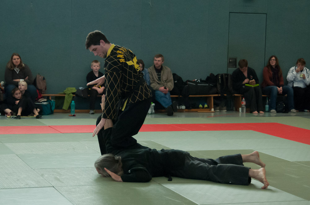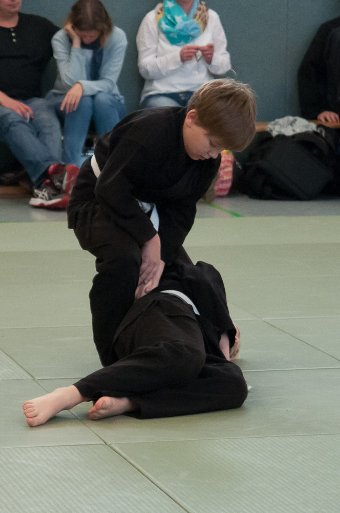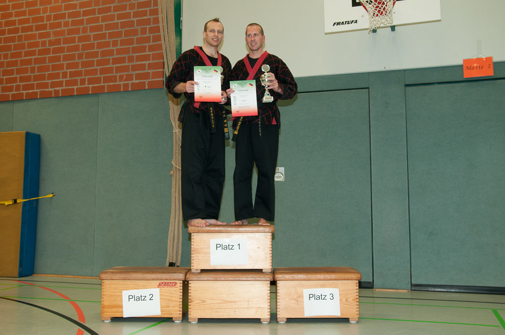 Der Vormittag stand im Zeichen der Selbstverteidigung. Bei der Jugend konnten die zahlreichen Zuschauer durchweg gute Leistungen sehen. Die jungen Teilnehmer mussten zunächst in einer ersten Runde sieben vorgegebene Techniken aus den Bereichen Fallschule, Fußtechniken und Hoshinsul demonstrieren. Nach der Auszählung der Punkte, die von den Wertungsrichtern in geheimer Bewertung erfolgte, hatten dann die Teilnehmer in der Reihenfolge ihrer Platzierungen sieben frei gewählte Techniken vorzuführen. Es macht immer wieder Freude festzustellen, mit welchem Eifer und Ernst unsere Kleinsten an den Start gehen Deshalb war es auch gerechtfertigt, dass jeder Teilnehmer zur Bestätigung seiner Leistung vom Landesjugendleiter Tobias Lohre eine Urkunde ausgehändigt bekam.