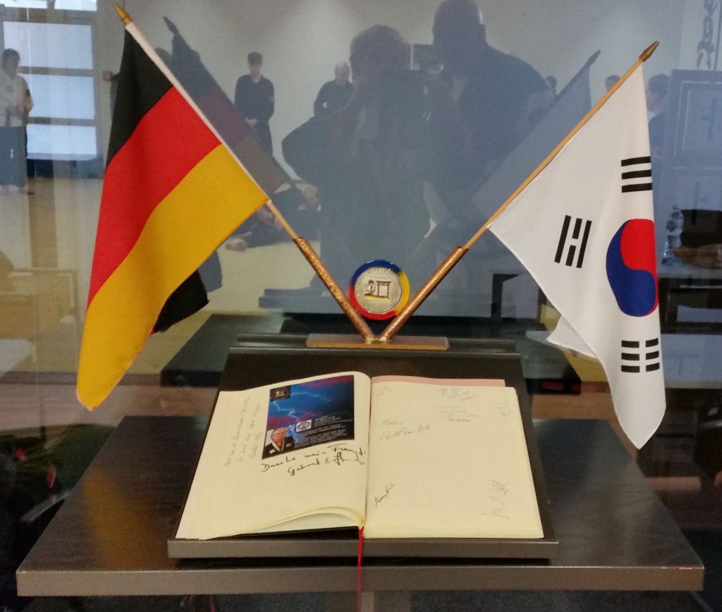 Gestärkt durch eine koreanische Kimchi-Suppe ging es nach der Mittagspause weiter mit einer kompakten Skizzierung der Geschichte des Hanminjok Hapkido. Dabei erläuterte Großmeister Klos einige historische Eckpunkte für die Entwicklung dieser Kampfkunst in Deutschland und nannte wichtige Großmeister der Stilrichtung in ihrem chronologischen Kontext. Im Anschluss folgten kleine Praxiseinheiten, in denen verschiedene Selbstverteidigungstechniken gelehrt wurden. In Abhängigkeit der Graduierung wurden wertvolle Finessen demonstriert, so dass z.B. den Meisterschüler der praktische Einsatz des Ki zur Erhöhung der Wirksamkeit einer Technik ermöglicht wurde. Darüber hinaus hatten die Seminarteilnehmer Gelegenheit, einige Techniken des Dan-Bong (Kurzstock) zu üben, der äußerst wirkungsvoll und variantenreich zur Selbstverteidigung eingesetzt werden kann.