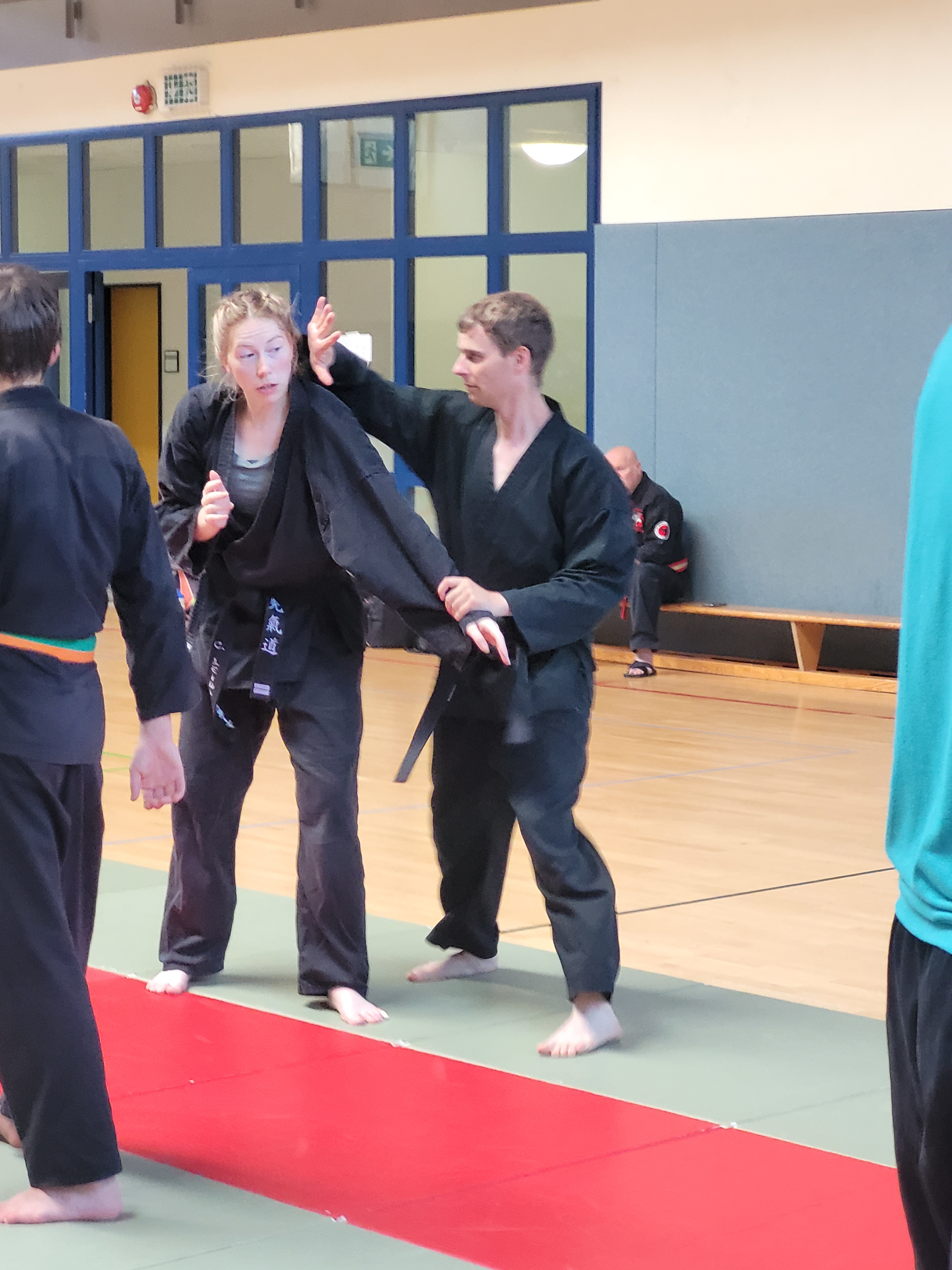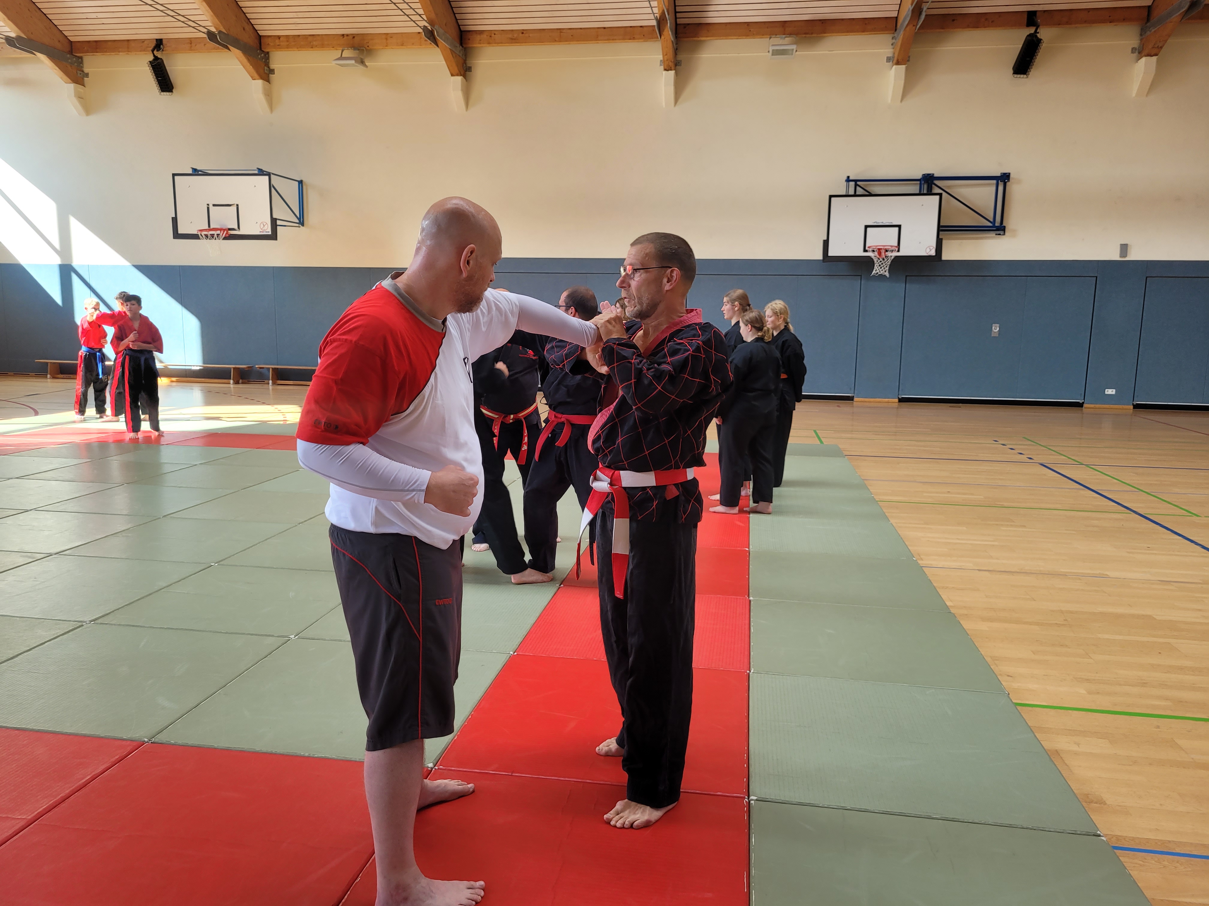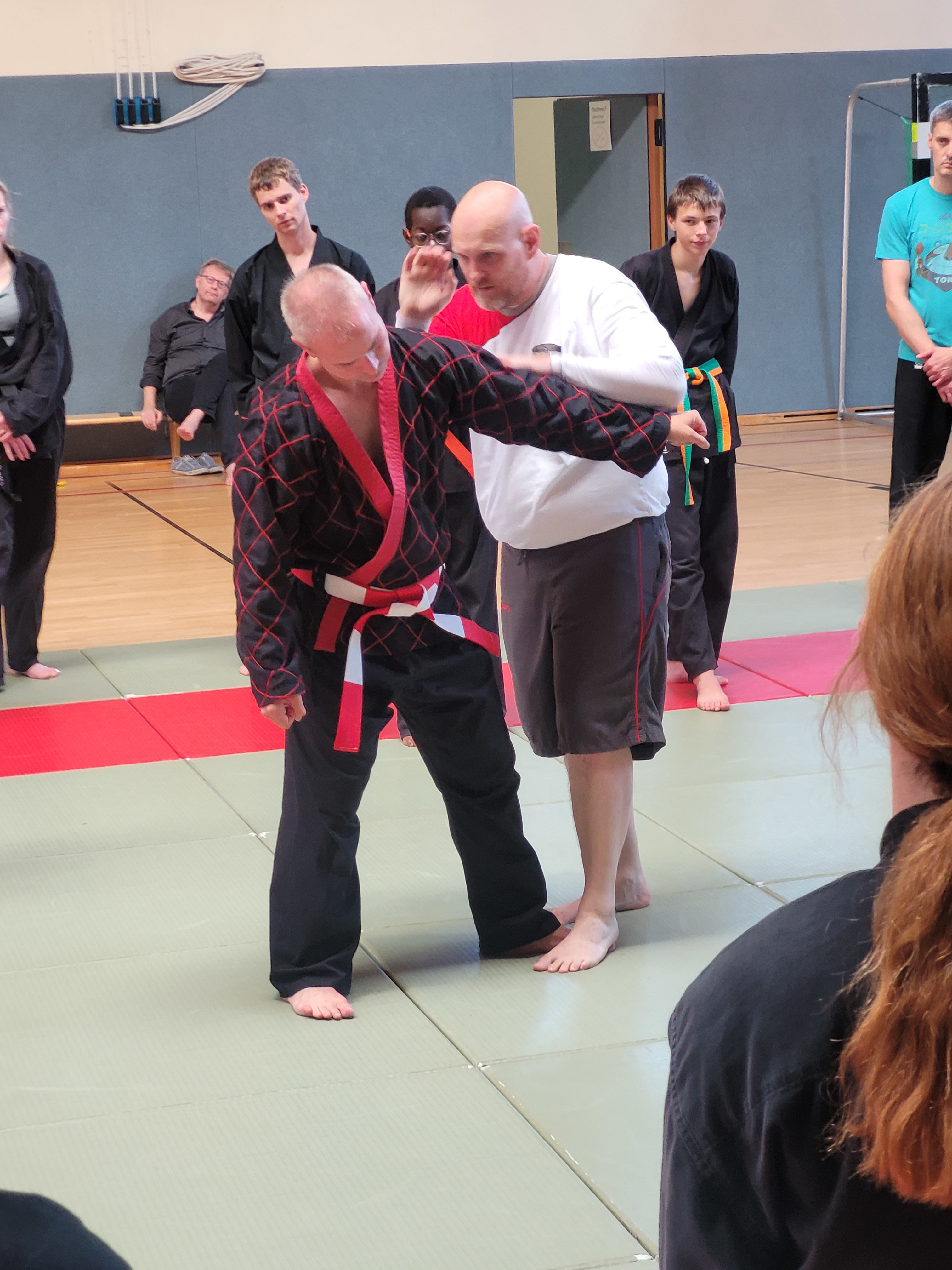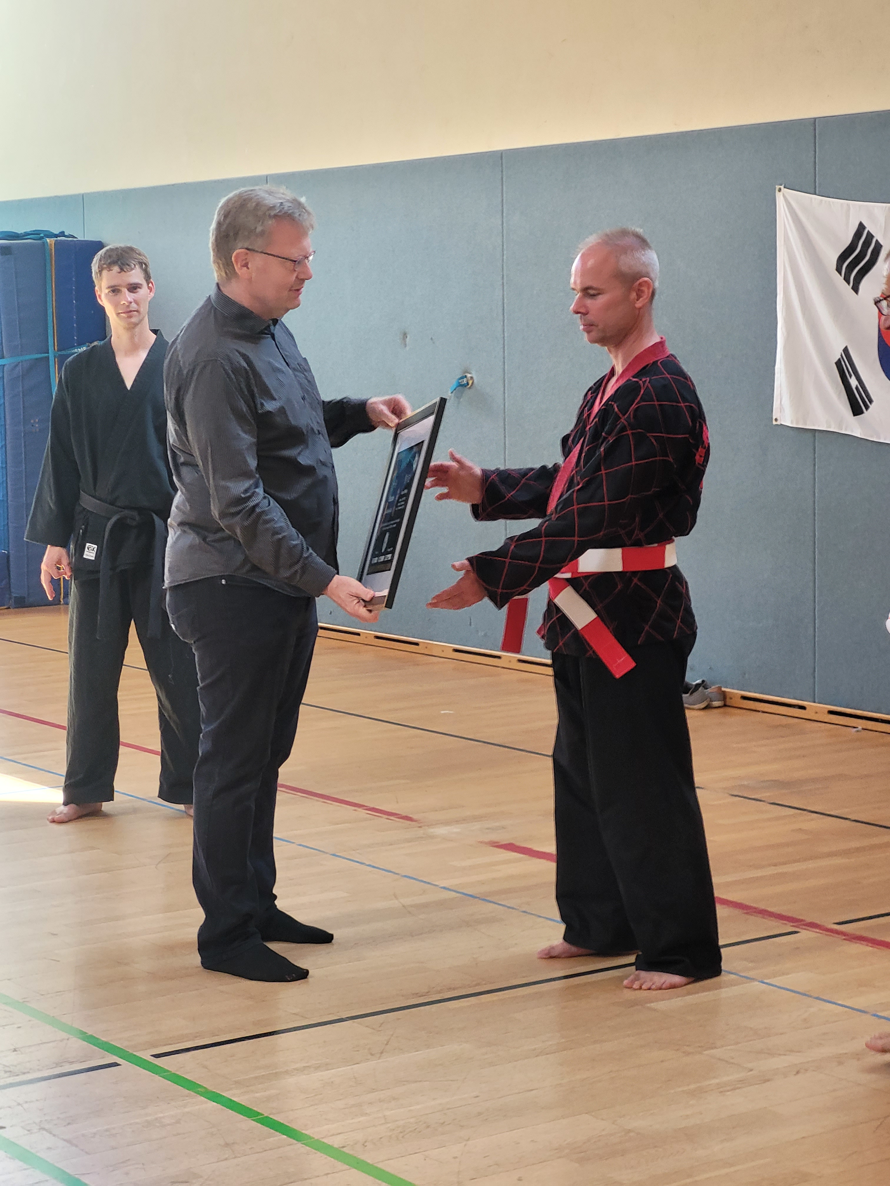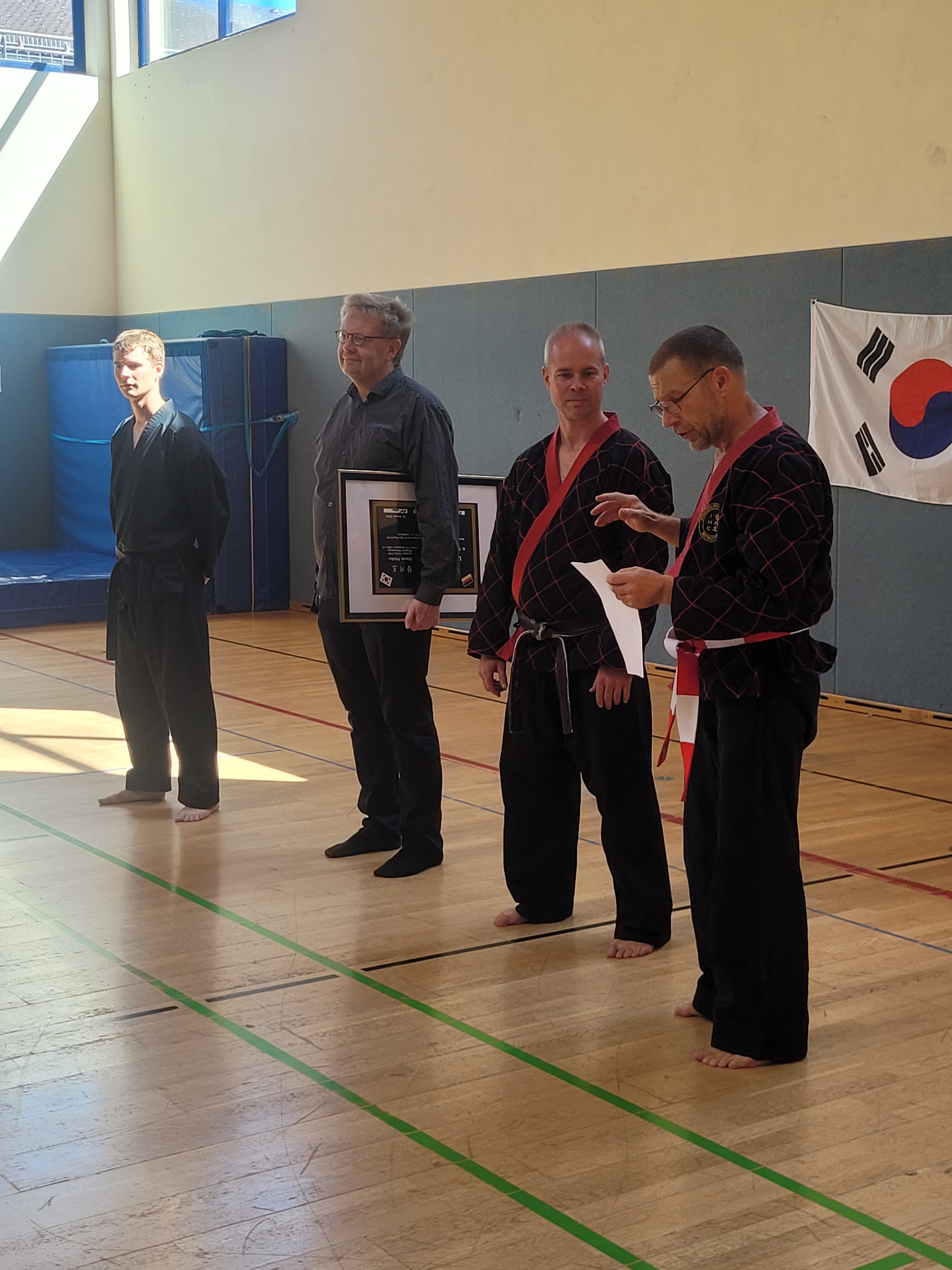 Im Mittelpunkt des siebenstündigen Lehrgangs stand die Verleihung des 6. Dans vom Nordrheinwestfälischen Hapkido Verbandes NWHV e.V. an Simon Pfeifer. Die Mitgliederversammlung des Landesverbandes hatte im März dem Antrag auf Danverleihung aufgrund seiner Leistungen und seines Einsatzes für den Hapkido-Sport als Trainer, Referent, Danprüfer und Ausrichter von Lehrgängen und Prüfungen stattgegeben. Olaf Müller (Prüfungsbeauftragter) und Janis Horch (Danbeauftragter) nahmen zusammen mit Jürgen Rath die Ehrung vor.