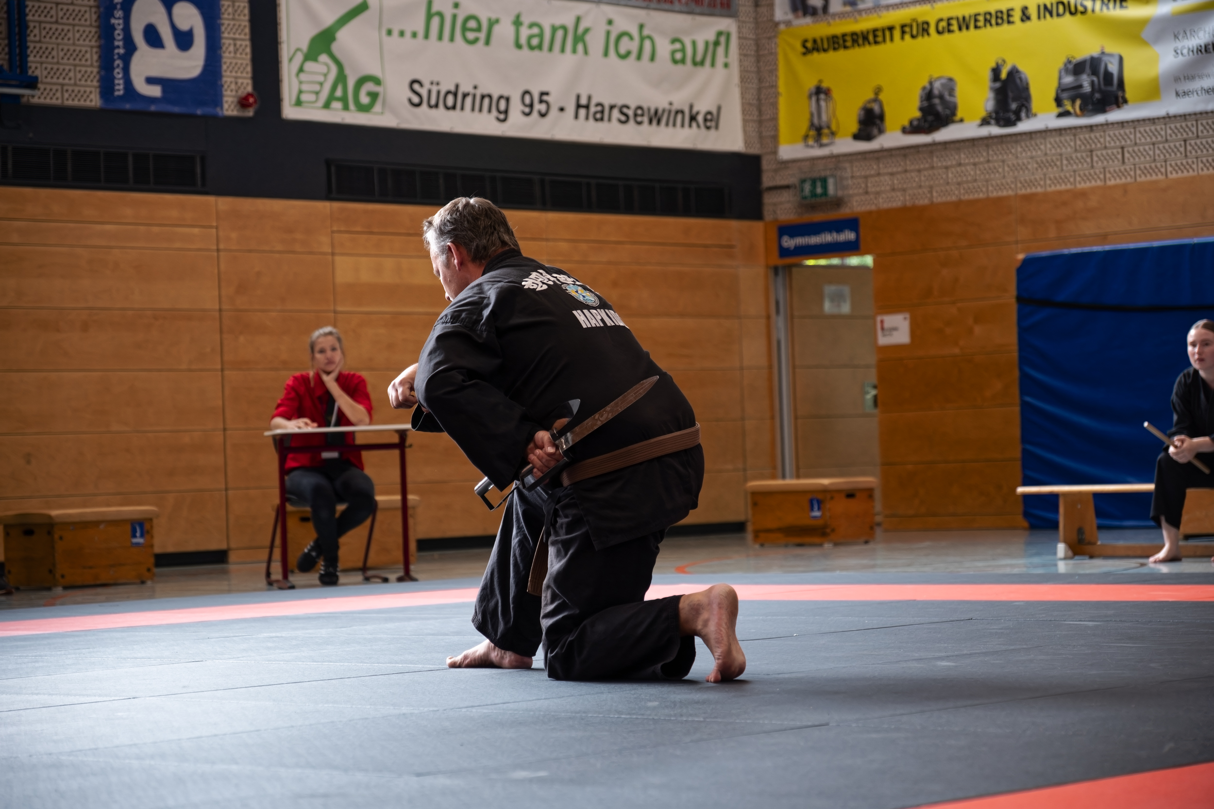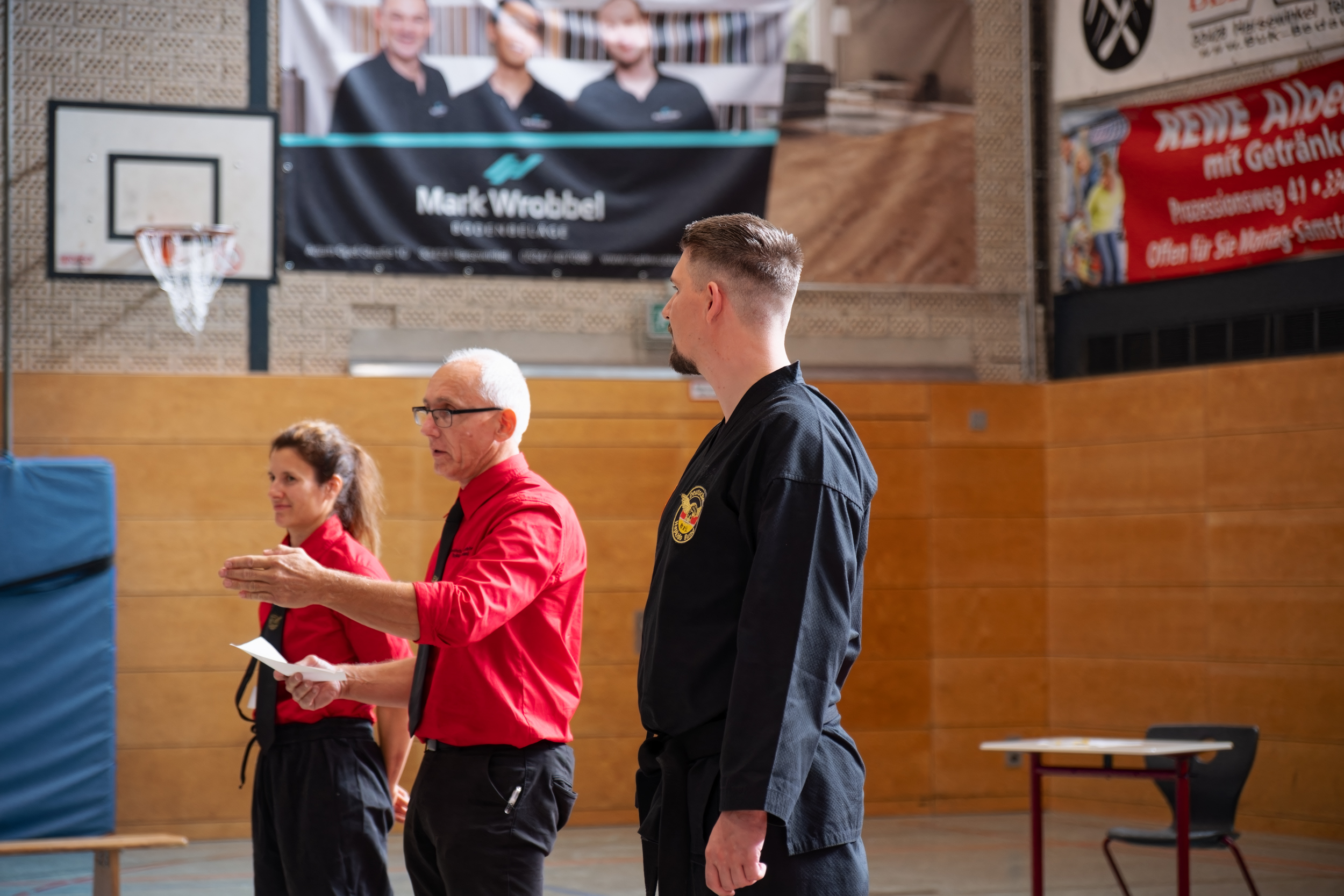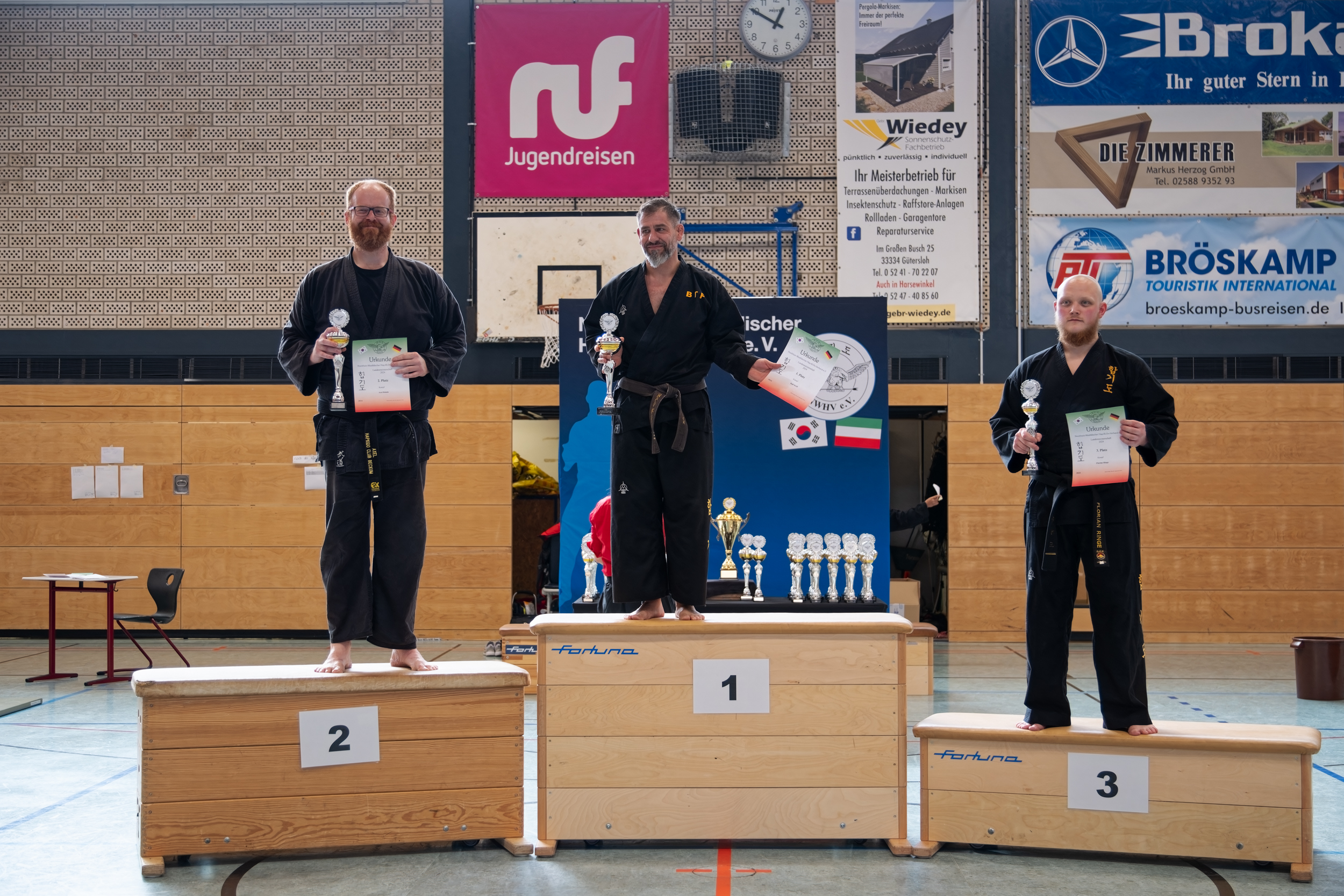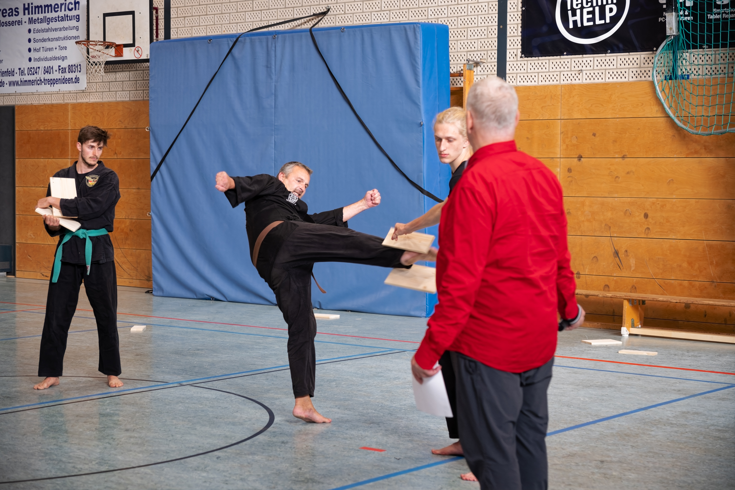 Bevor die Kategorie „Bruchtestform“ den Abschluss der Meisterschaft bildete, stellten die Danträger ihr Können eindrucksvoll unter Beweis. Unter der Kampfrichter-Leitung von den Großmeistern Franz-Josef Wolf (IX. Dan, Aachen) und Detlef Klos (IX. Dan, Oelde) konnten folgende Landesmeister gekürt werden: