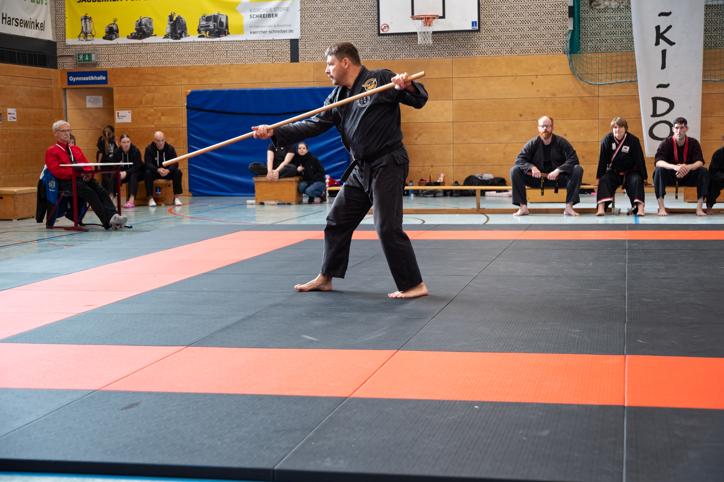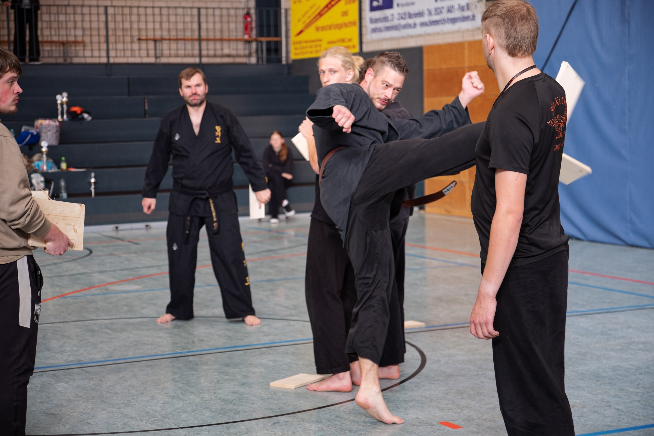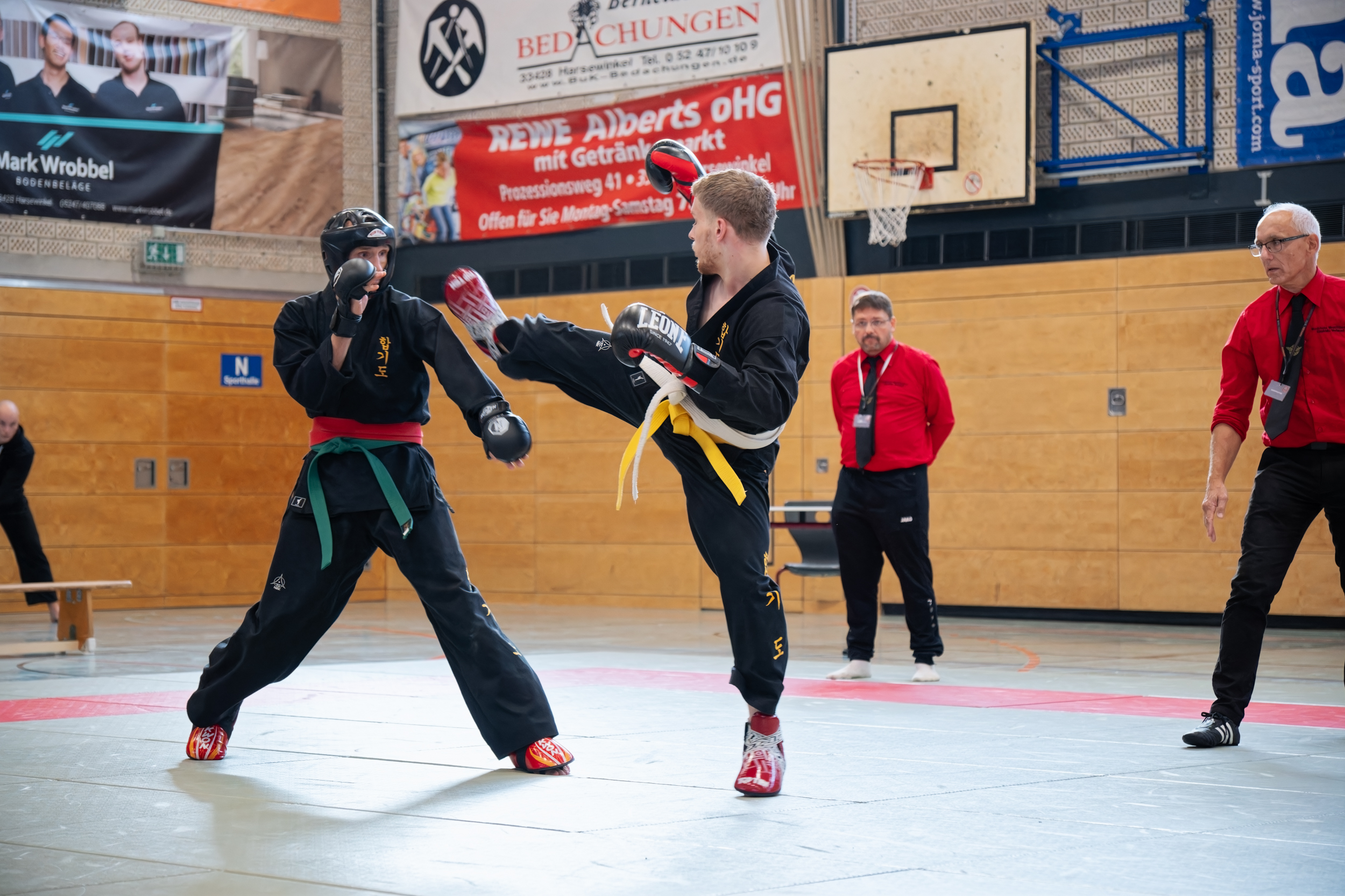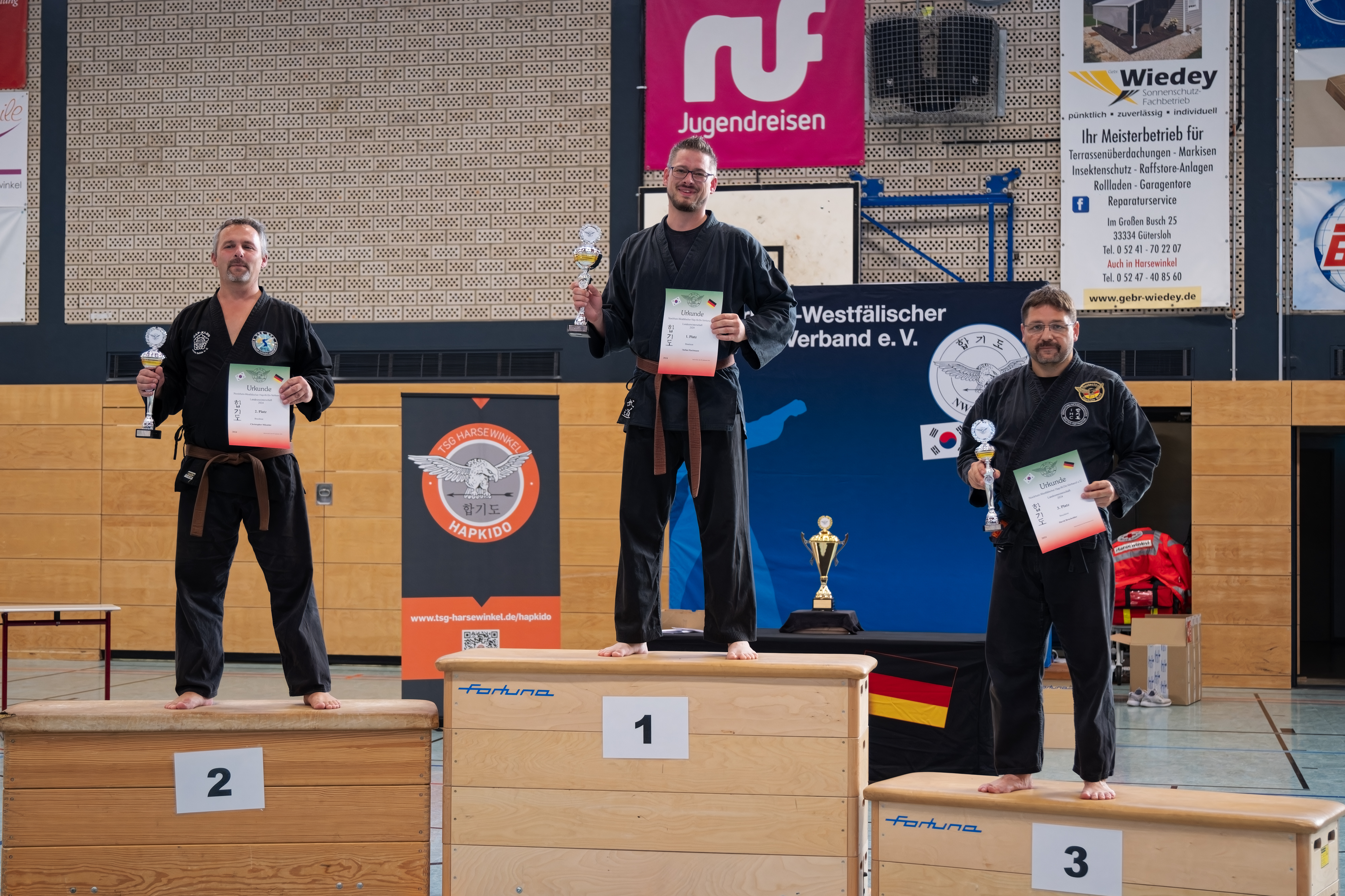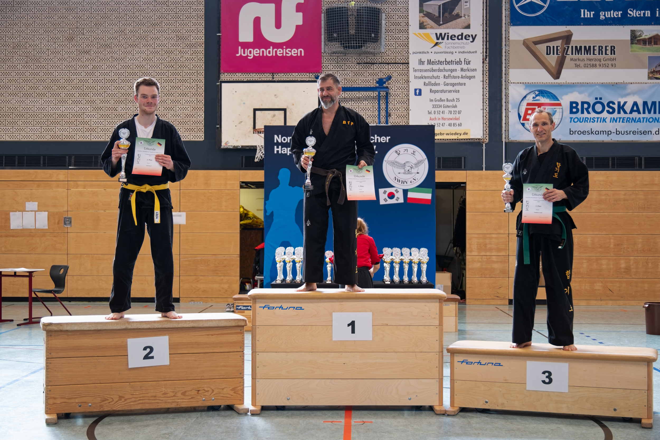 Bevor die Kategorie „Bruchtestform“ den Abschluss der Meisterschaft bildete, stellten die Danträger ihr Können eindrucksvoll unter Beweis. Unter der Kampfrichter-Leitung von den Großmeistern Franz-Josef Wolf (IX. Dan, Aachen) und Detlef Klos (IX. Dan, Oelde) konnten folgende Landesmeister gekürt werden: